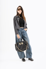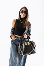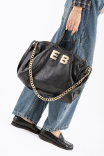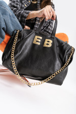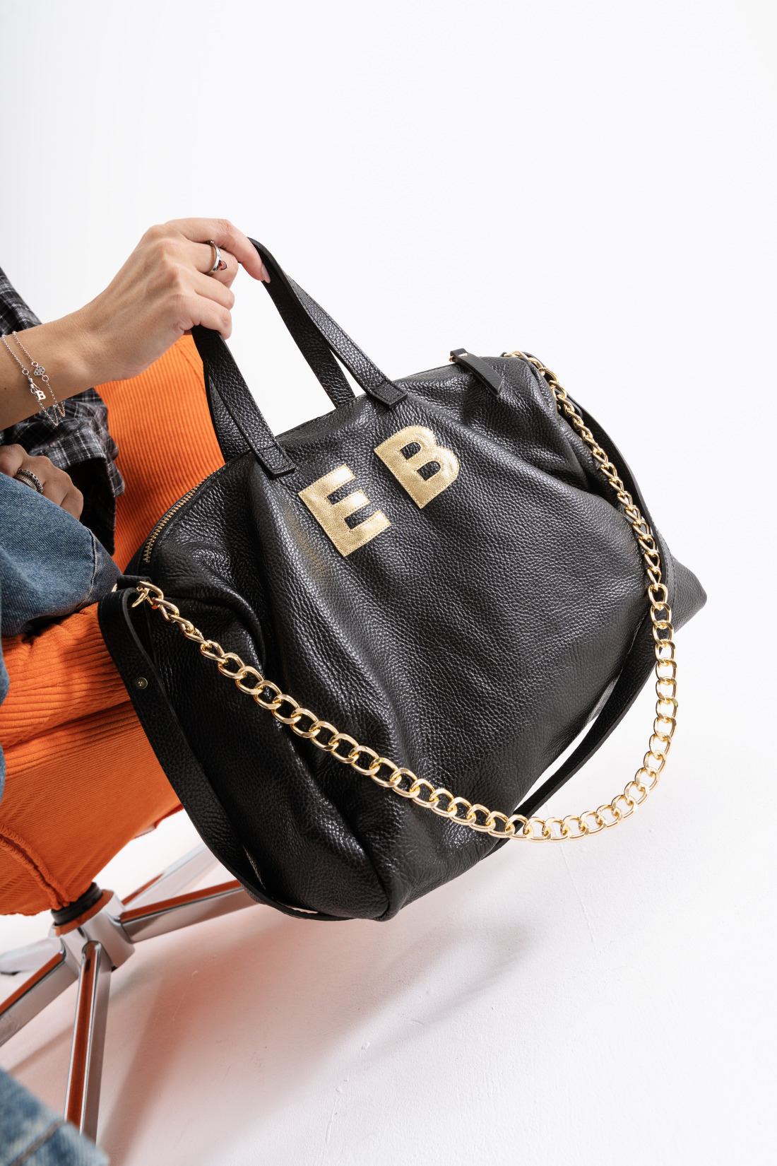 Borsa in vera pelle bottalata nera con doppia tracolla in pelle e in catena dorata.