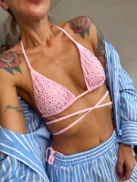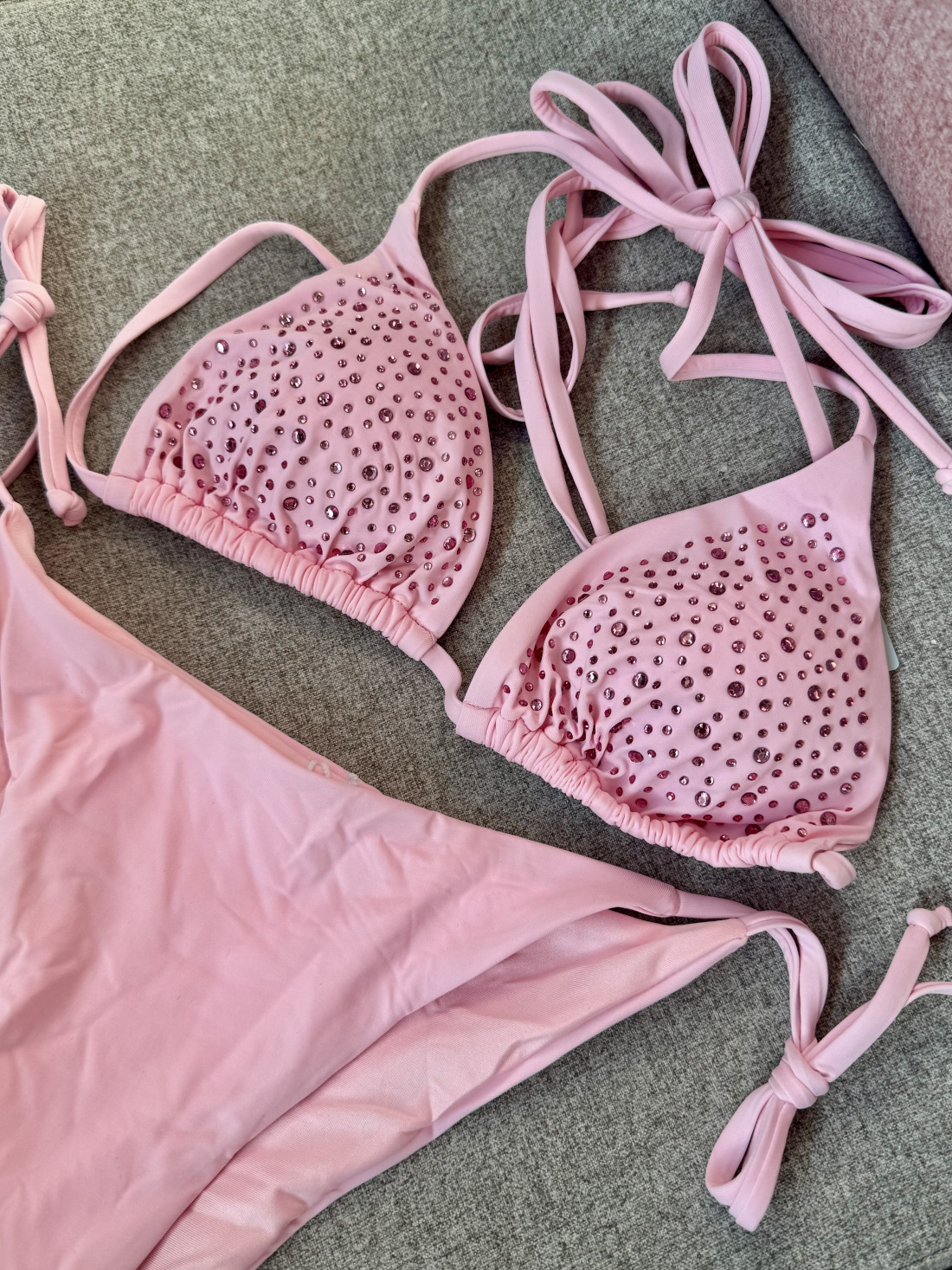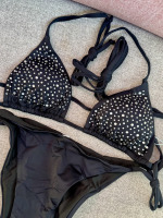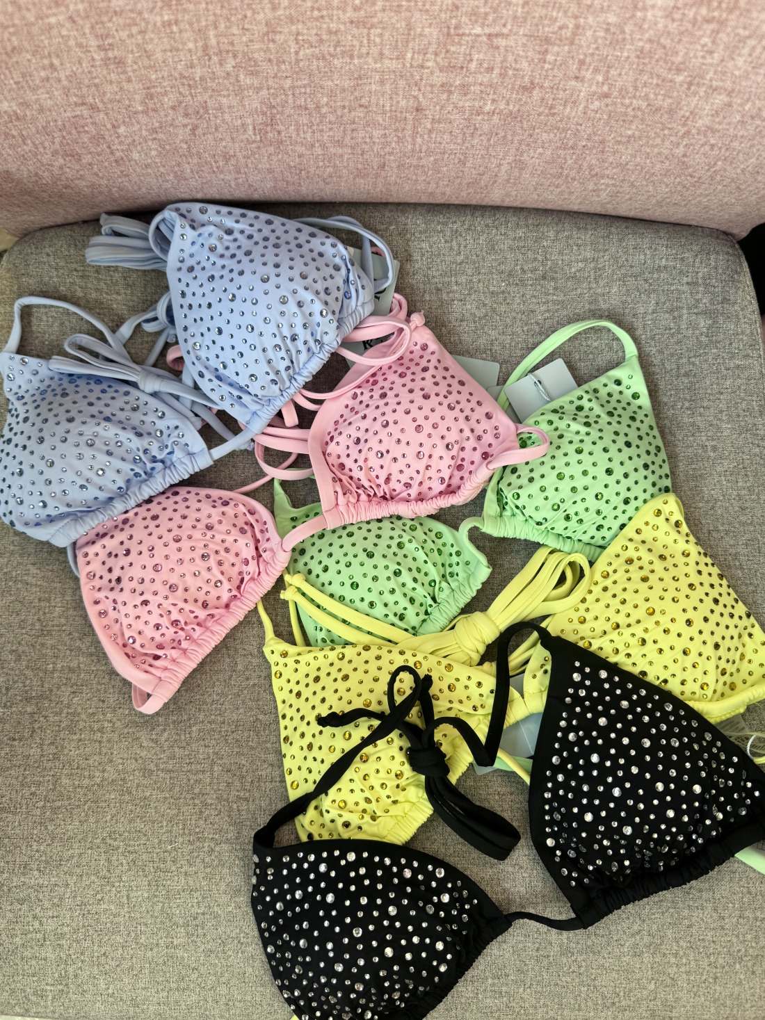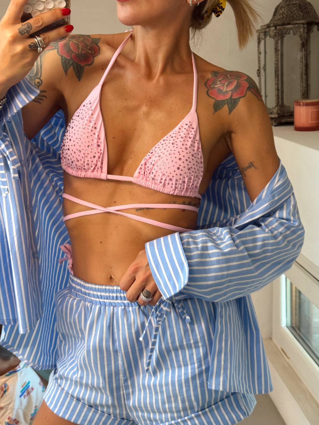 • Top a triangolo con coppette rimovibili, strass applicati, laccetti regolabili in vita