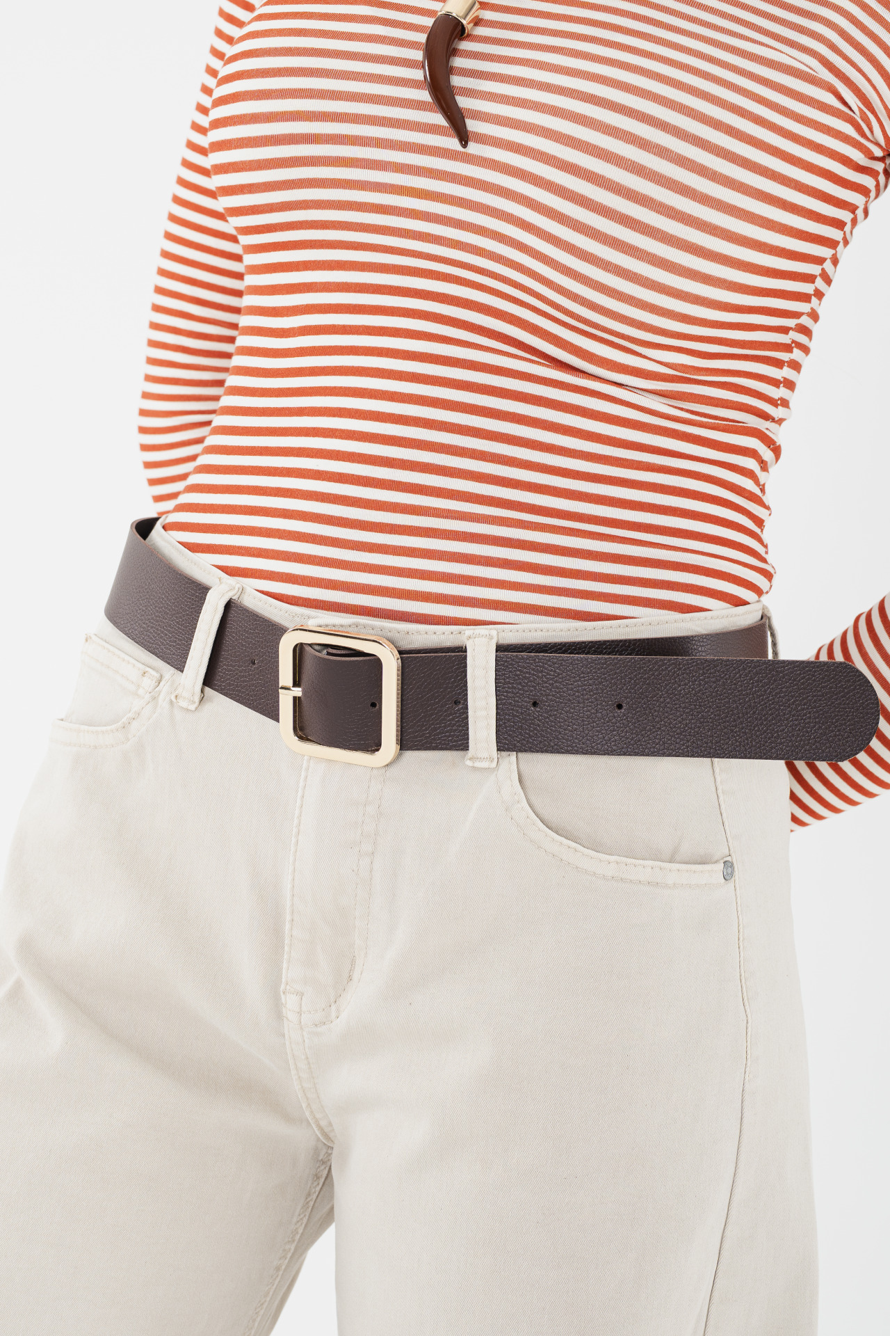 Cintura in pelle sintetica marrone con fibbia dorata.