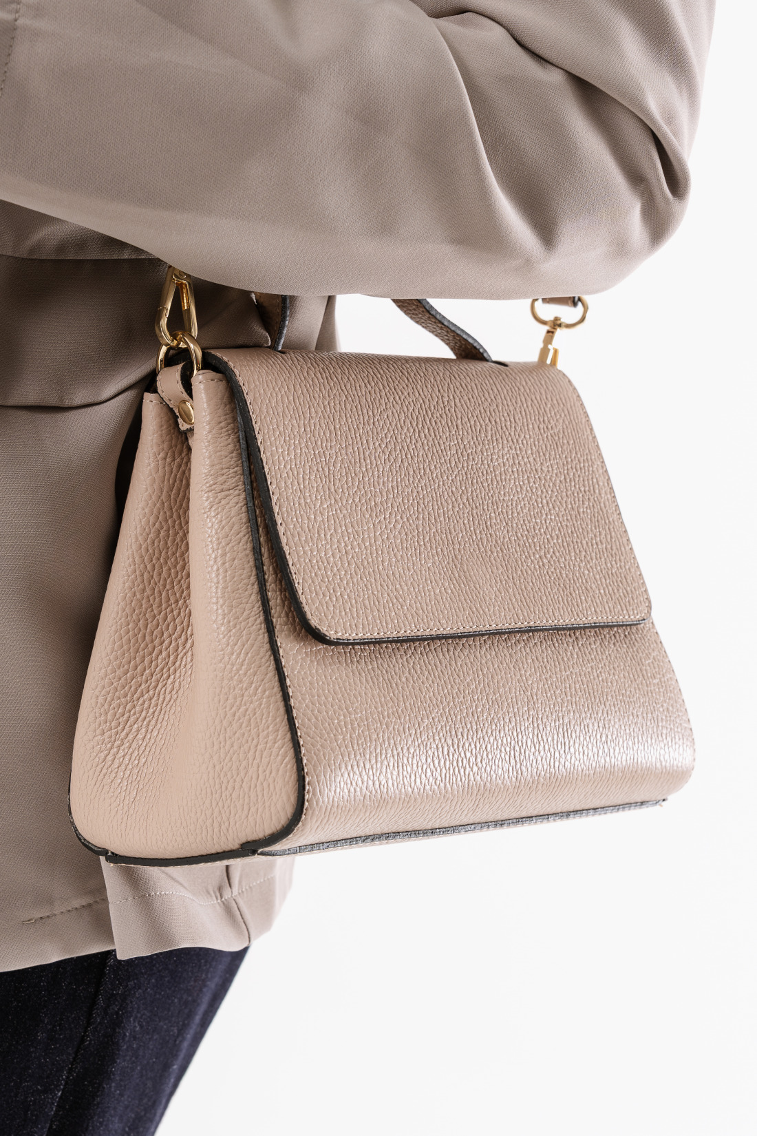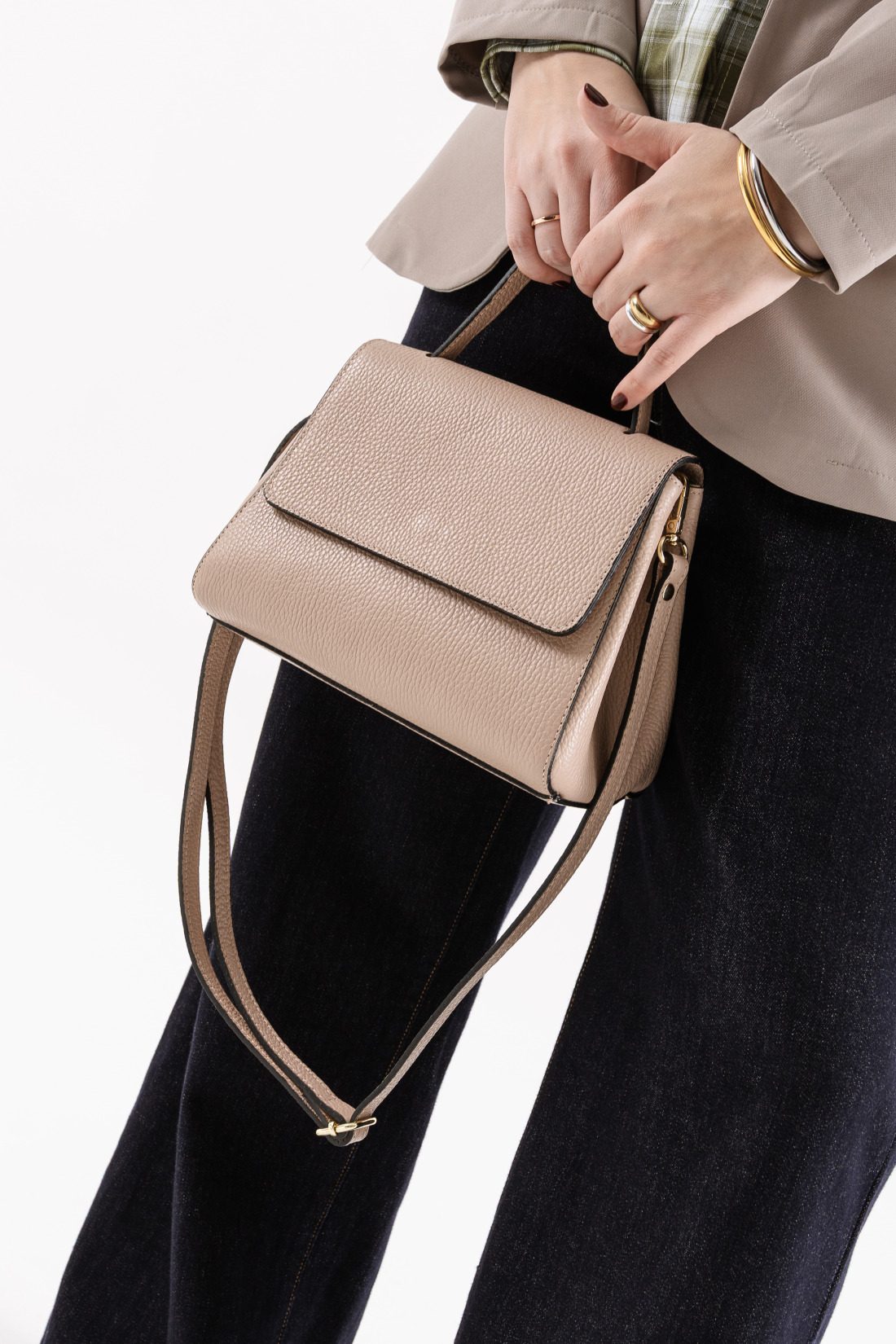 Borsa in vera pelle bottalata con patta dotata di chiusura magnetica.