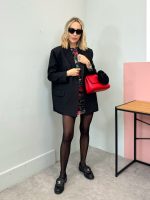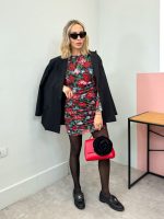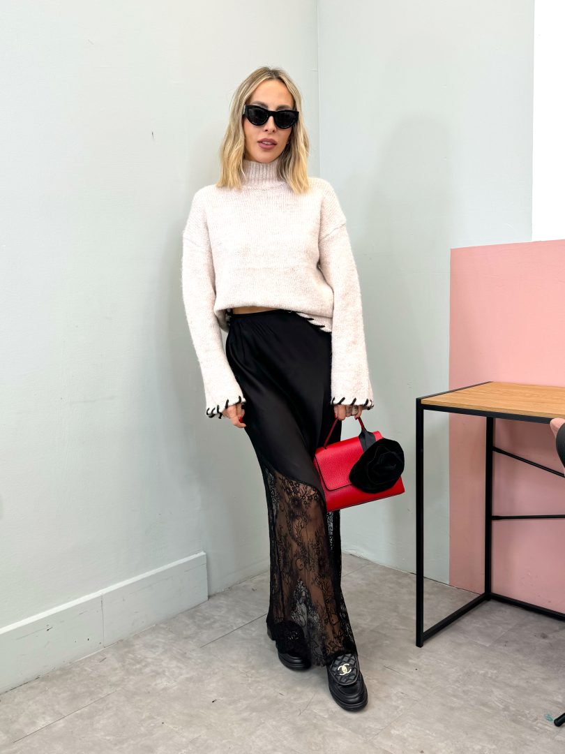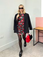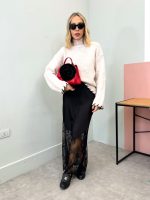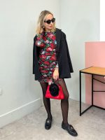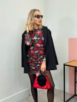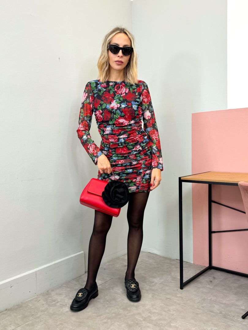 Un dettaglio distintivo è l’applicazione di una grande decorazione floreale nera sul lato, che aggiunge un contrasto chic e un accento femminile al design.