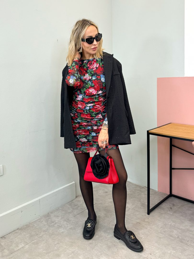- Decorazione floreale: Grande fiore nero applicato sul lato.