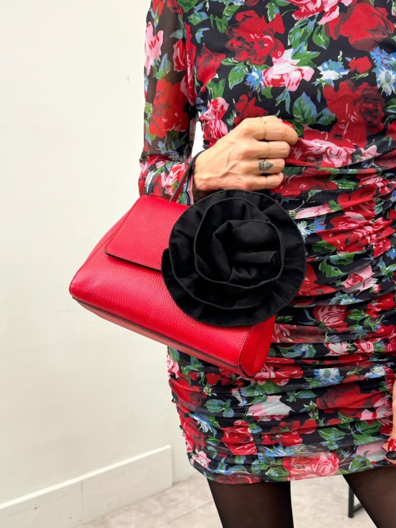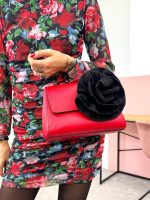 - Design elegante e audace: Il rosso acceso e il fiore nero creano un contrasto sofisticato.
