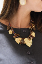 Collana in tessuto con charm cuori dorati.