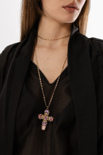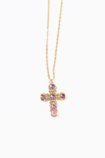 Collana lunga dorata in ottone con ciondolo a forma di croce con pietre sintetiche rosa.