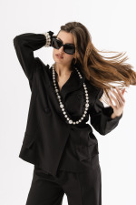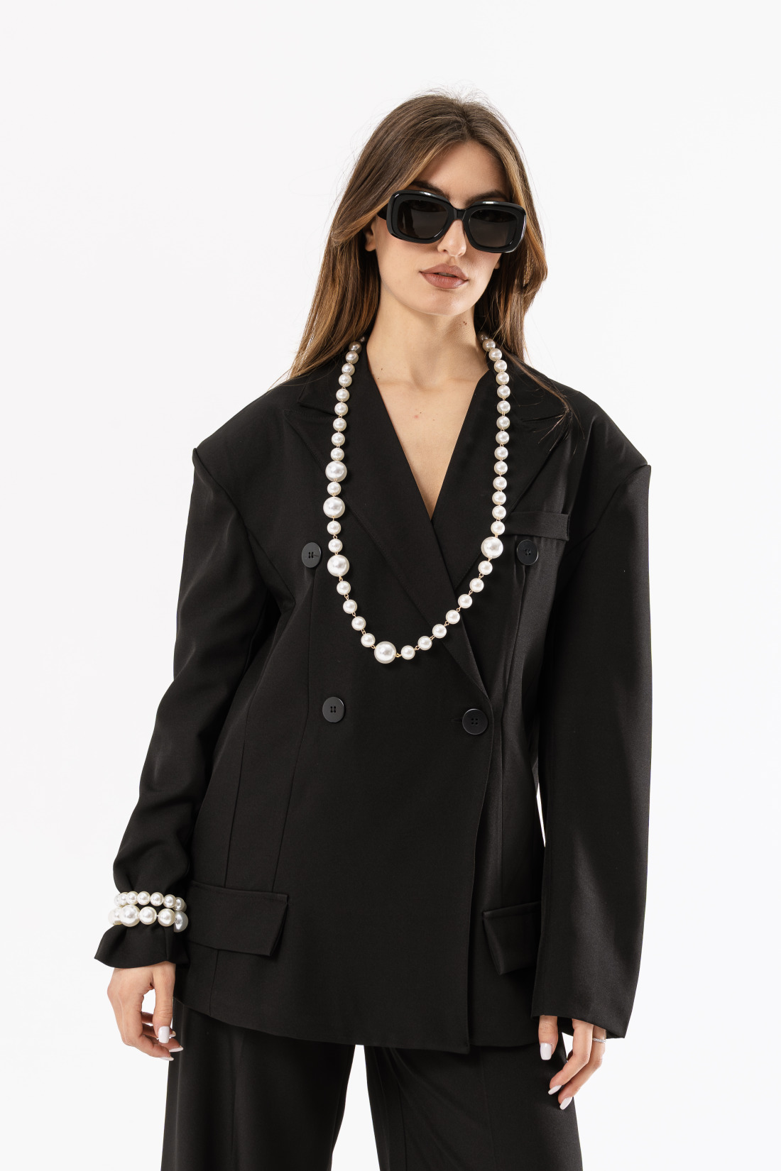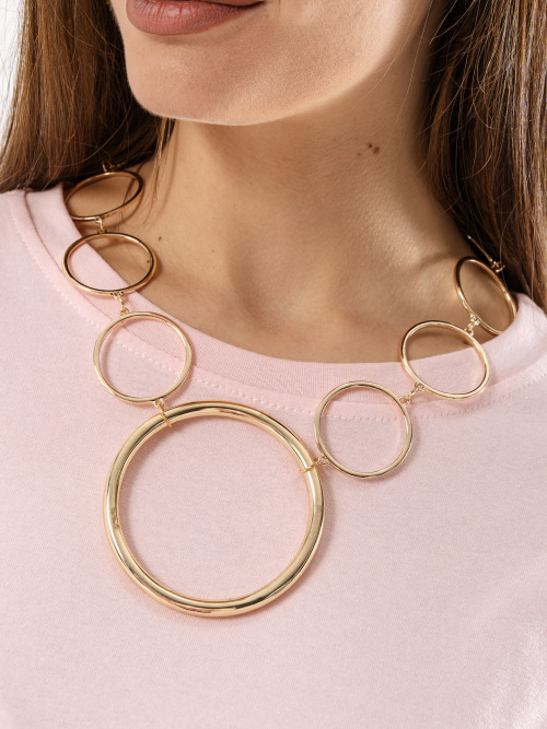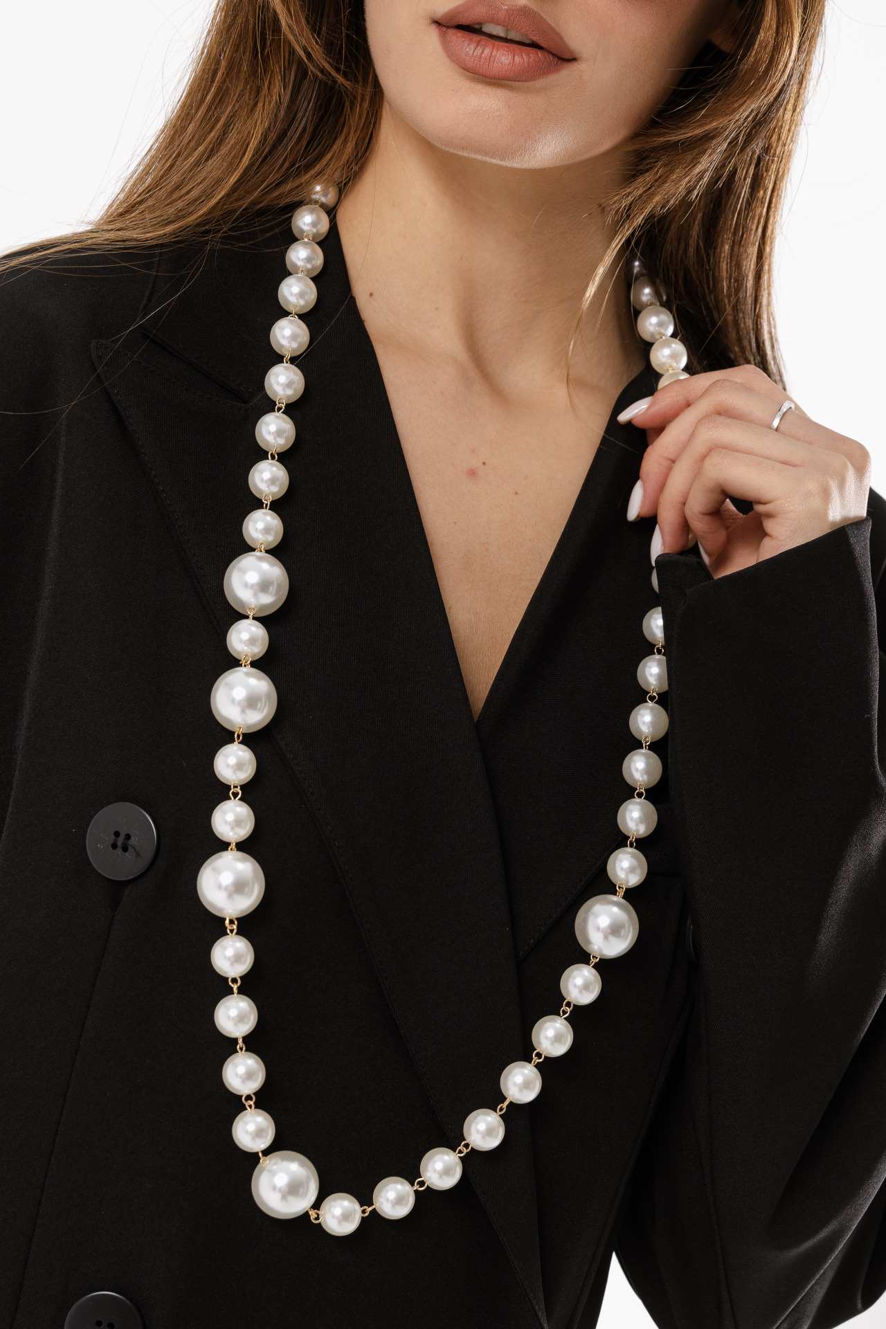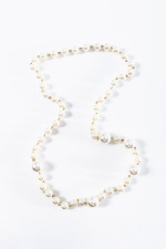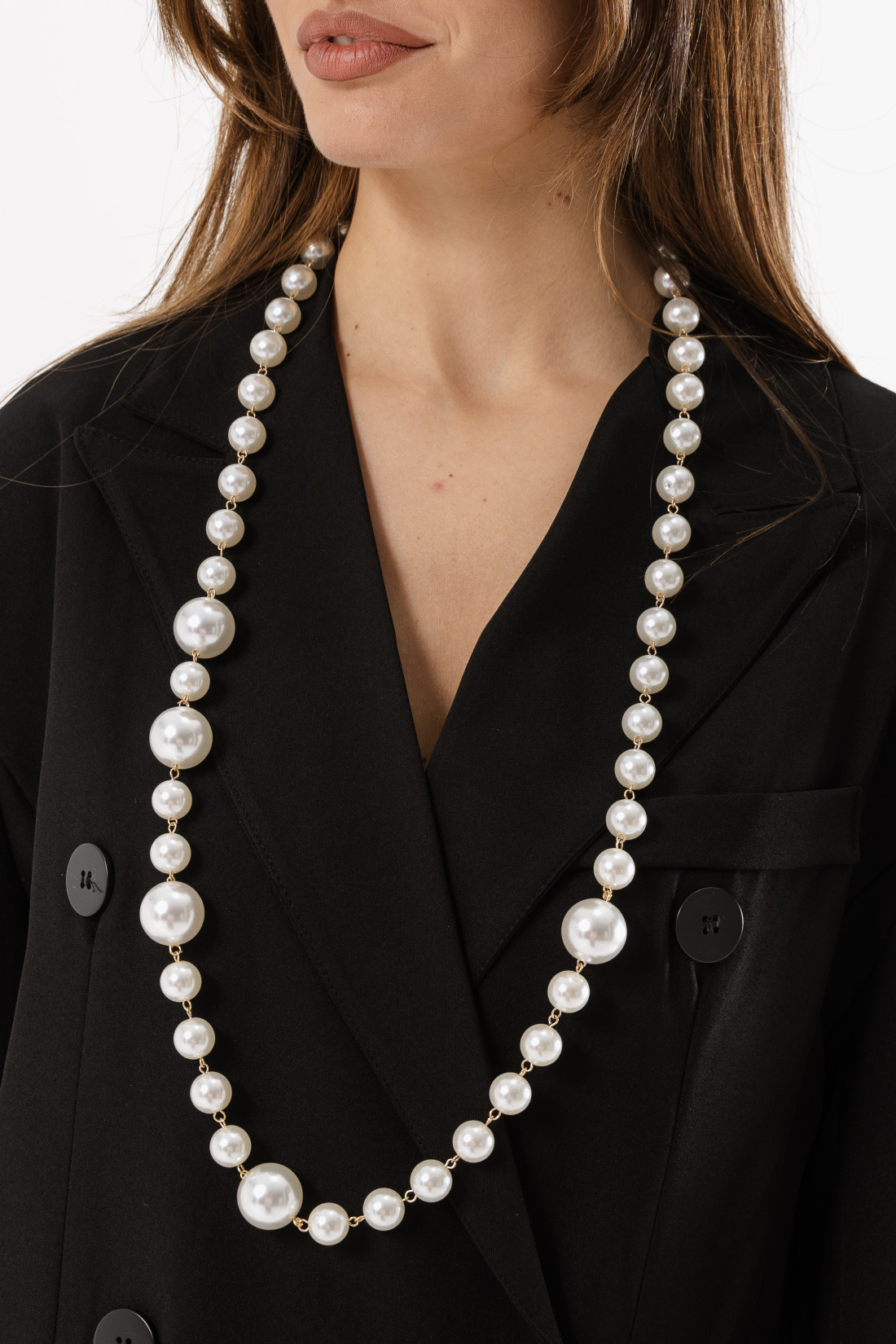 Collana lunga con perle sintetiche di varie dimensioni.