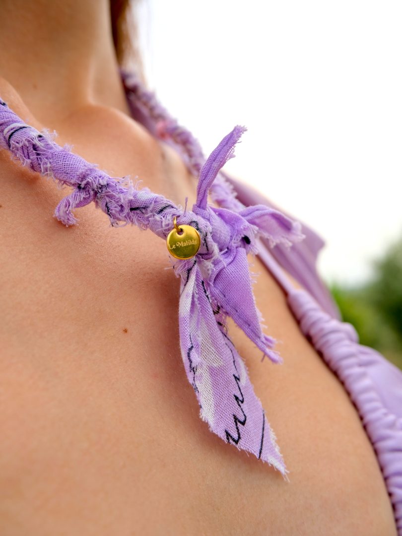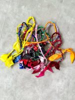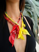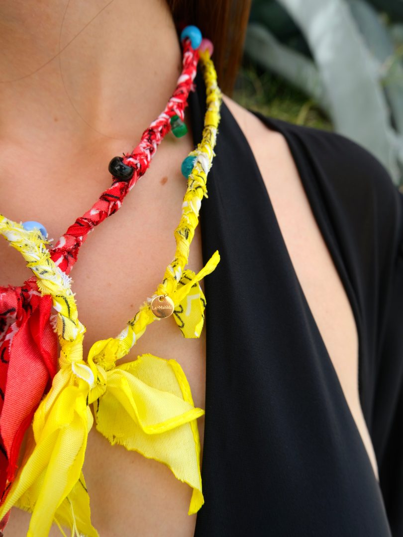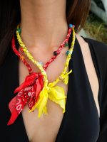 Collana in tesssuto bandana intrecciato a mano. Chiusura con nodo.
