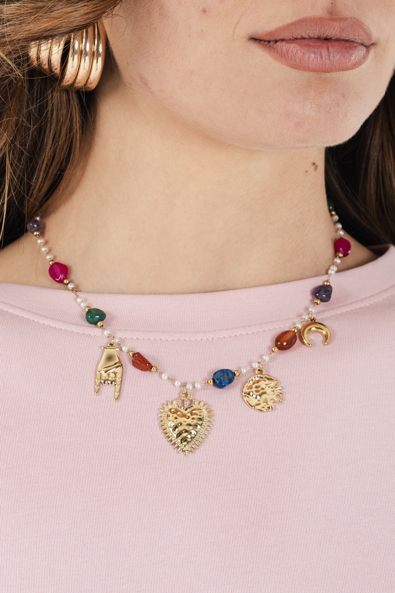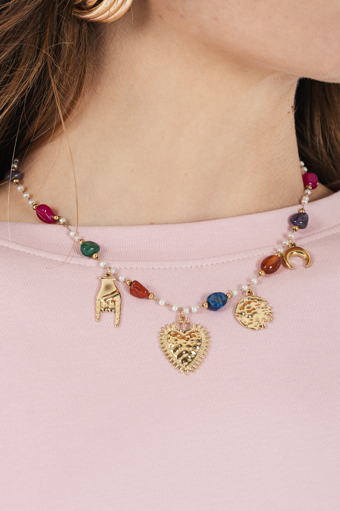 Collana in acciaio dorata con charms vari e pietre colorate.