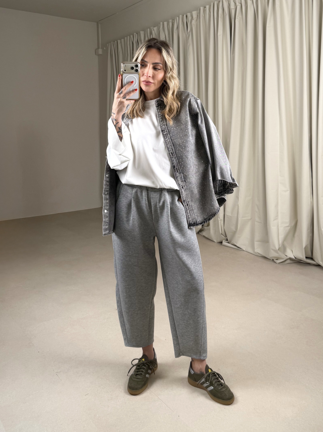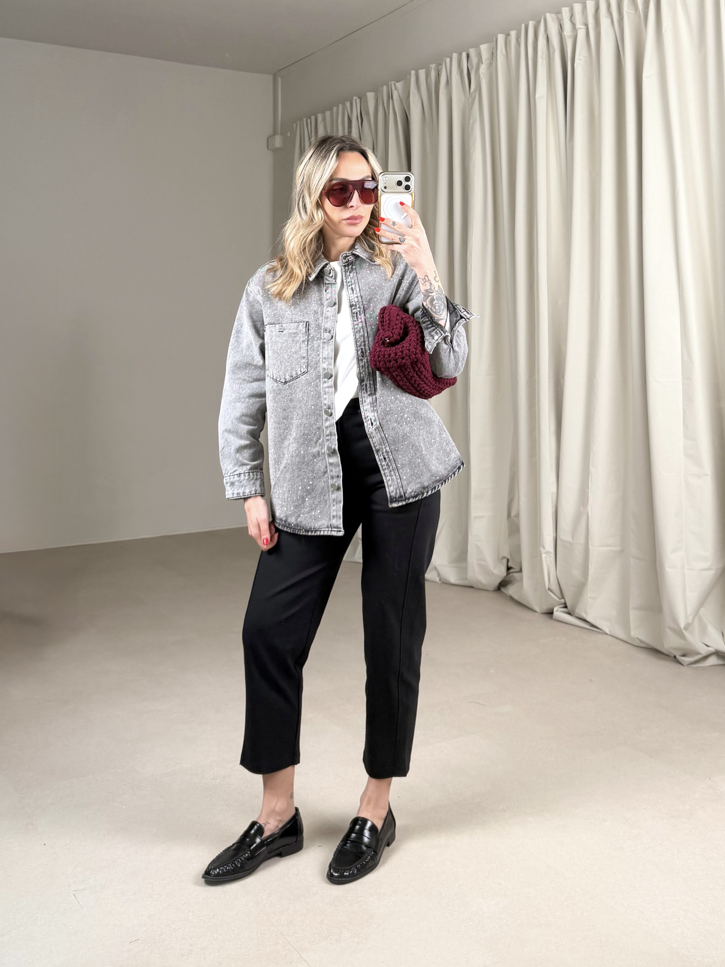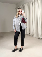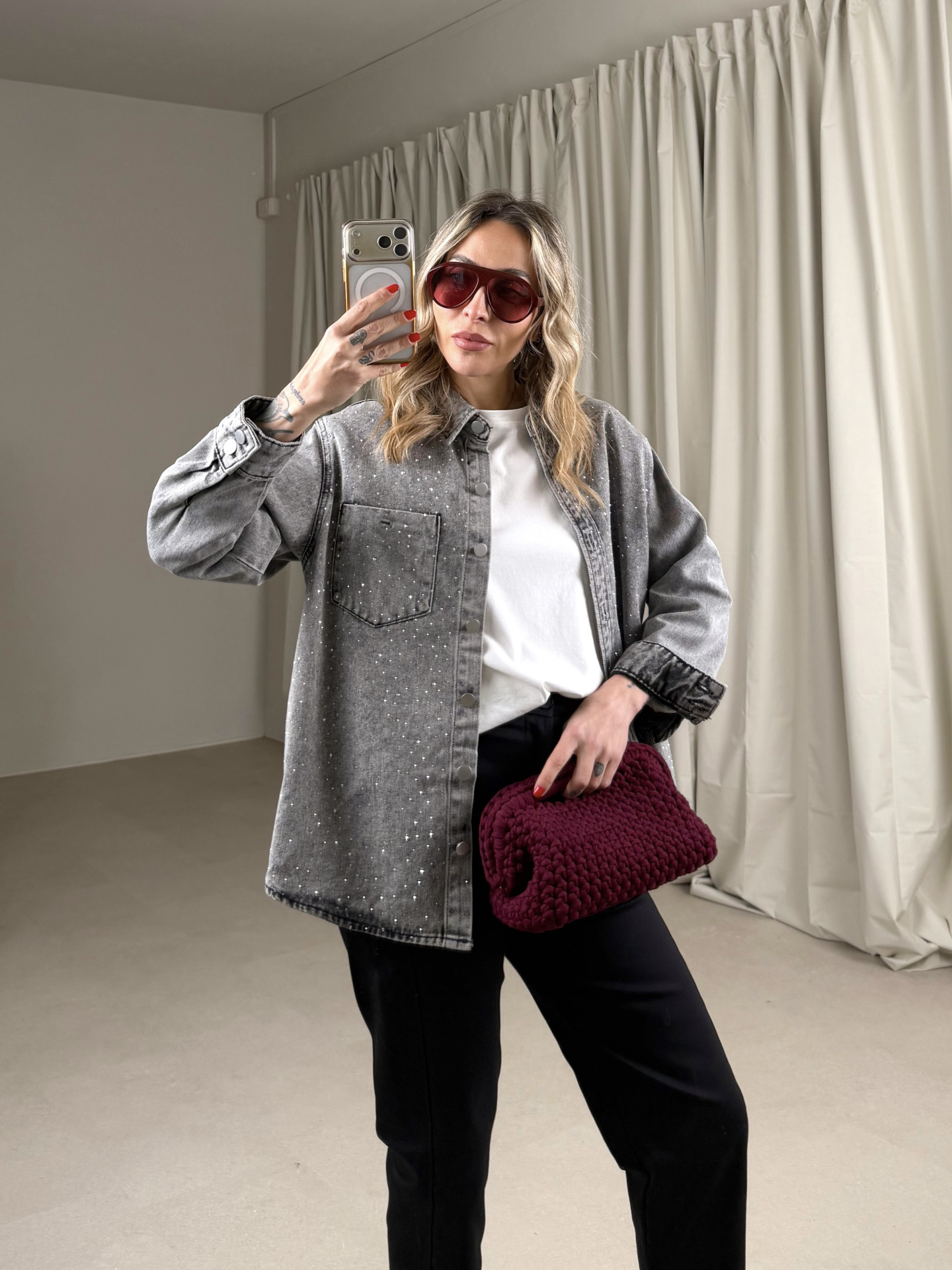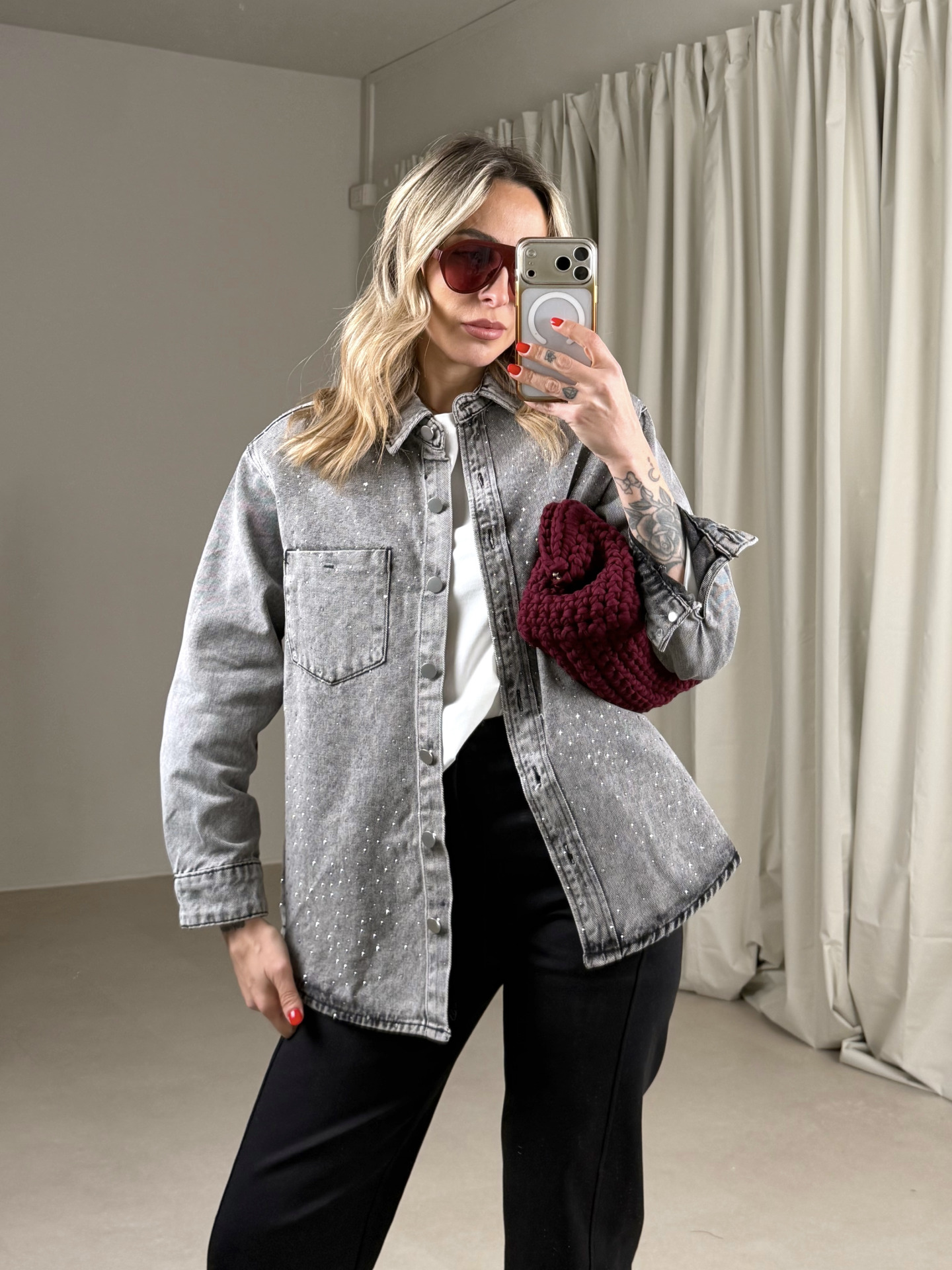 - tela denim grigia con strass applicati