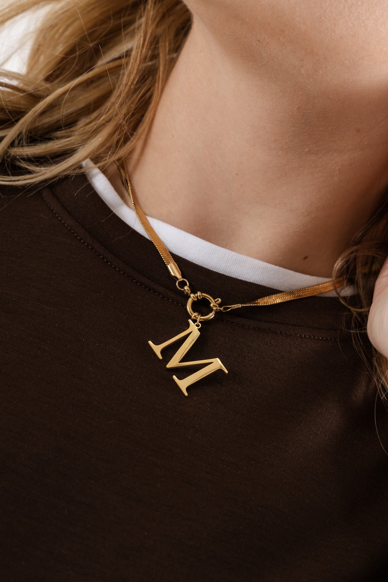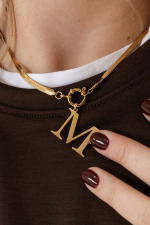 Collana piatta con chiusura a moschettone rotondo, ciondolo lettera personalizzabile.