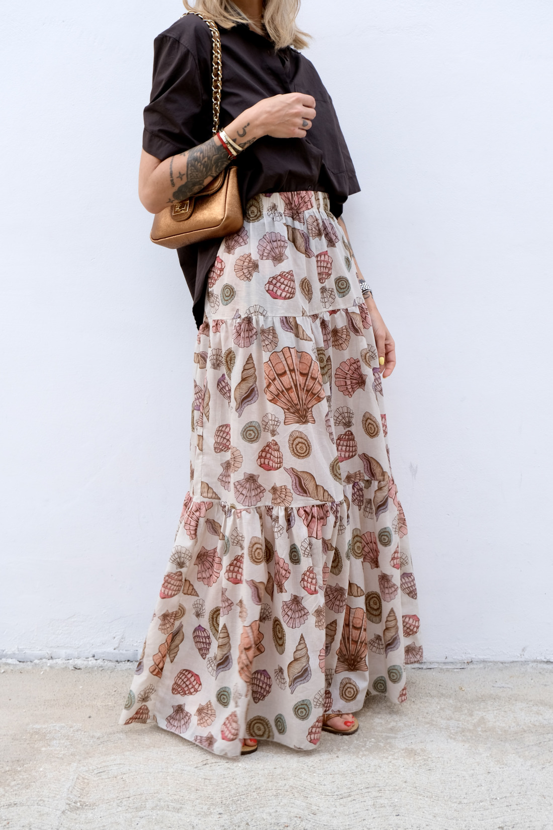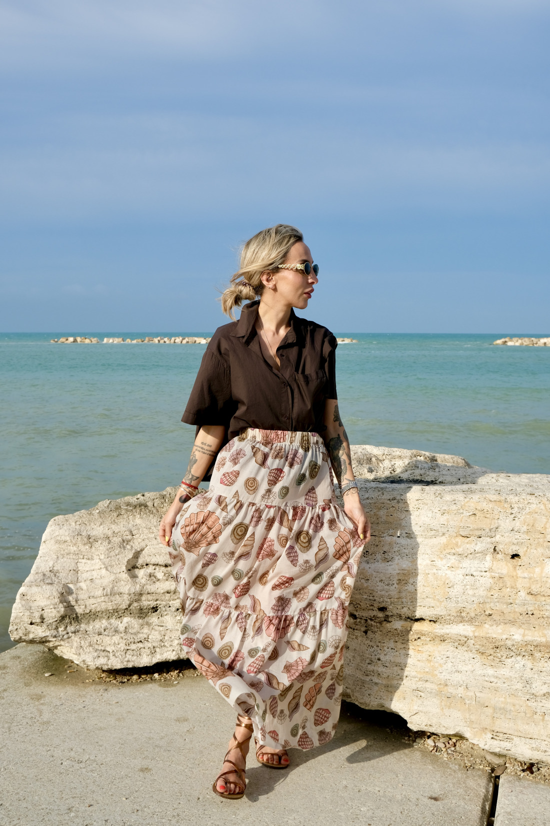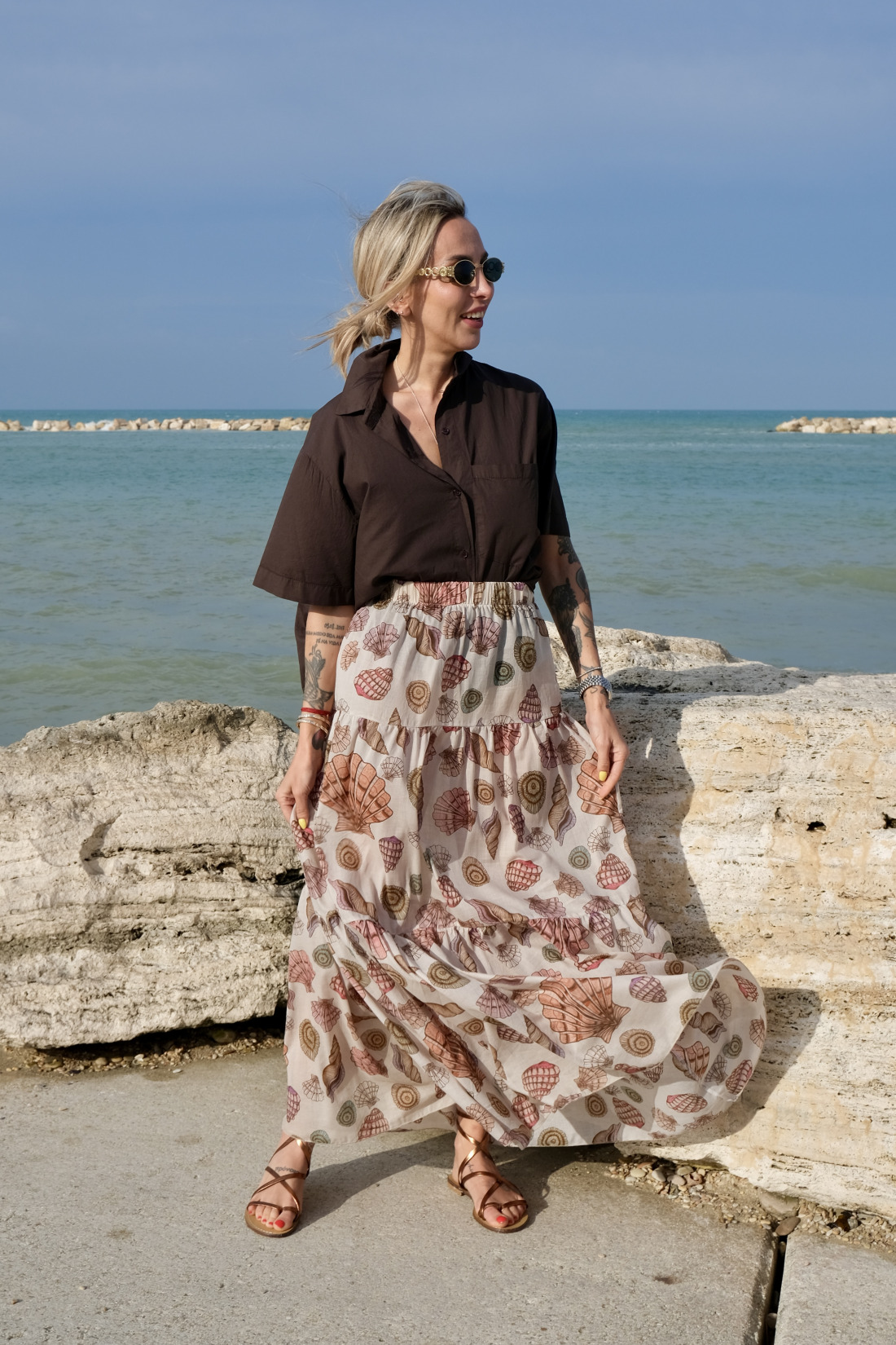 • Stampa a tema marino con conchiglie e motivi naturali in tonalità calde (rosa, beige, marrone e bordeaux)