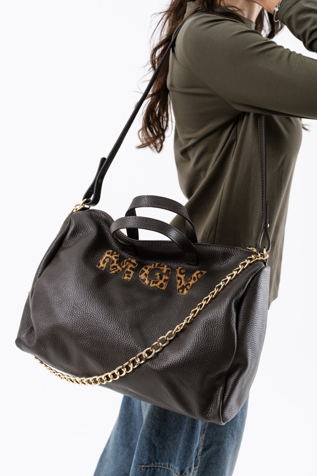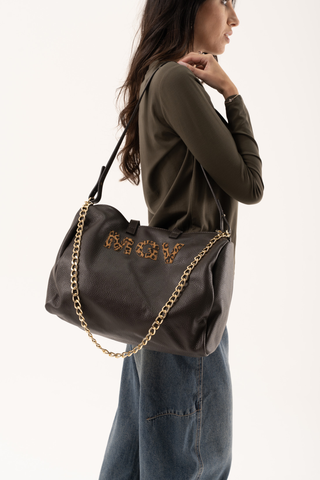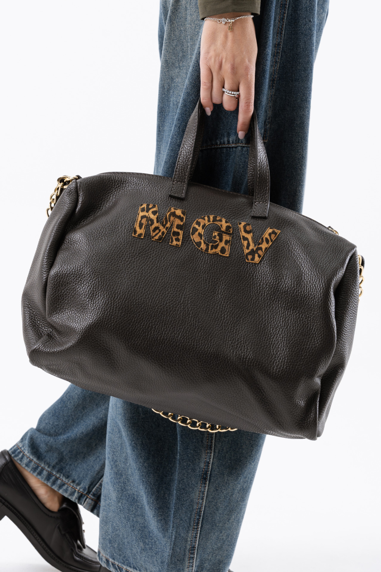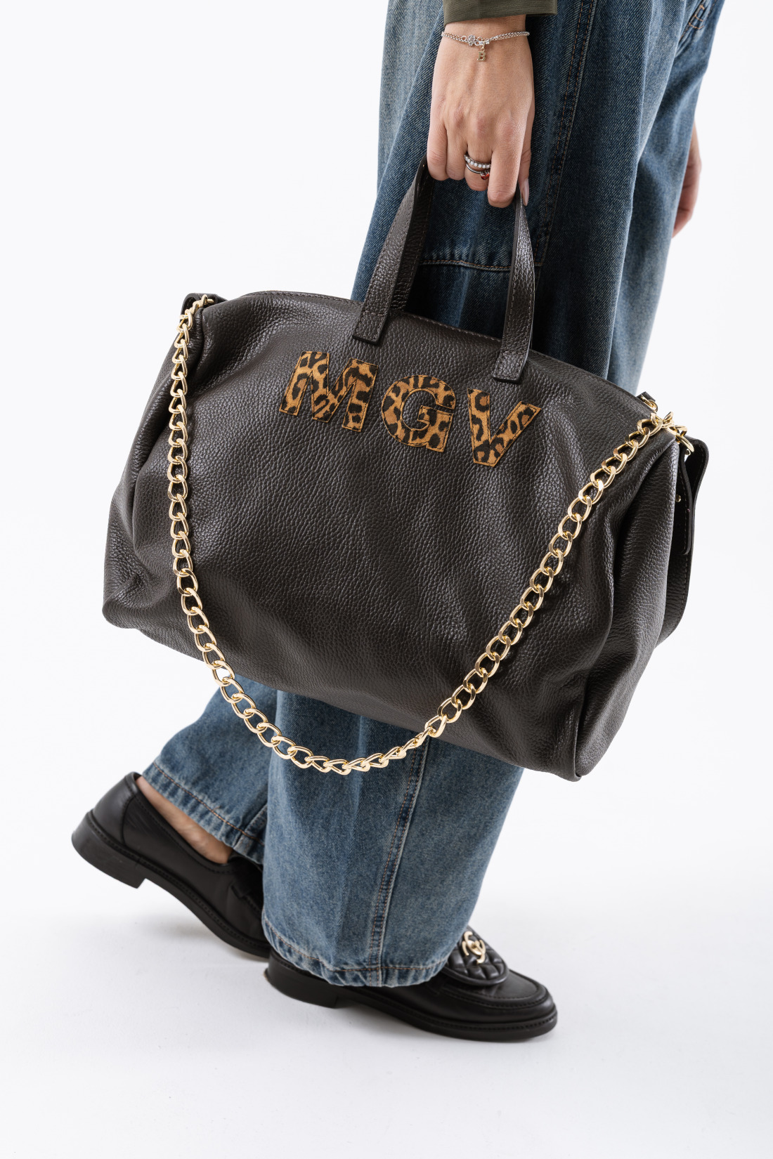 Il colore scuro della pelle si abbina facilmente a diversi outfit e stili, mentre il dettaglio delle lettere dorate offre un piacevole contrasto.