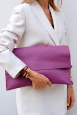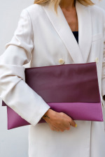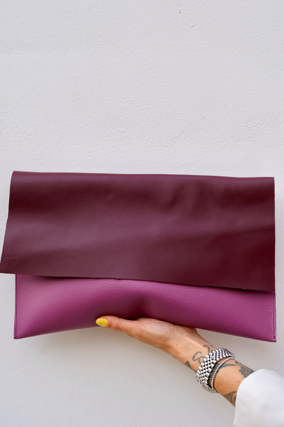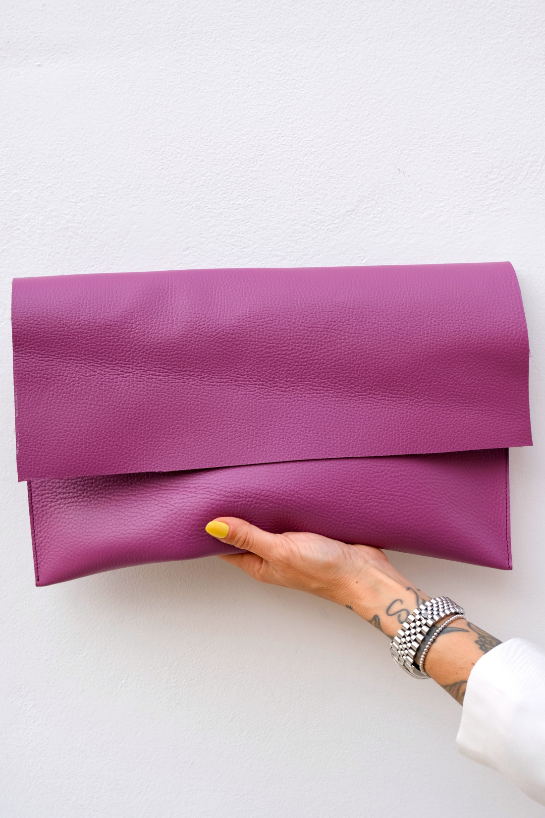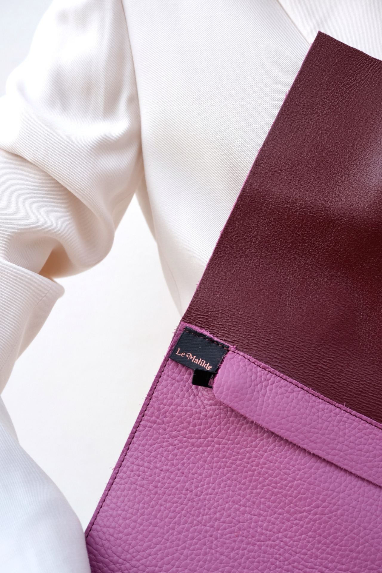 Pochette in vera pelle bottalata lilla, interno in vera pelle bordeaux.