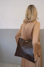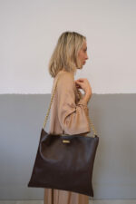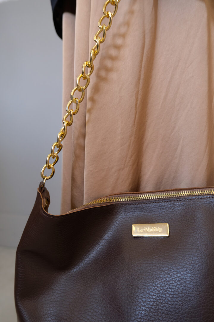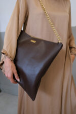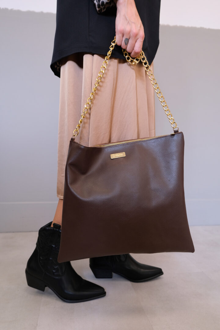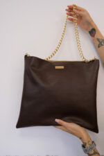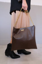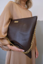 Borsa maxi pochette in vera pelle bottalata marrone con tracolla catena dorata.