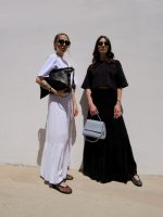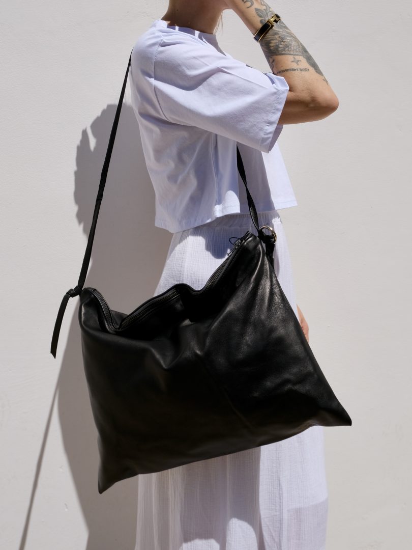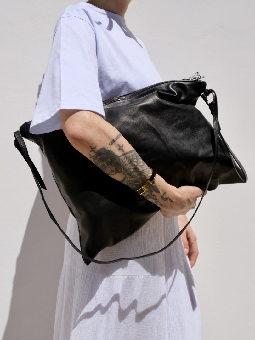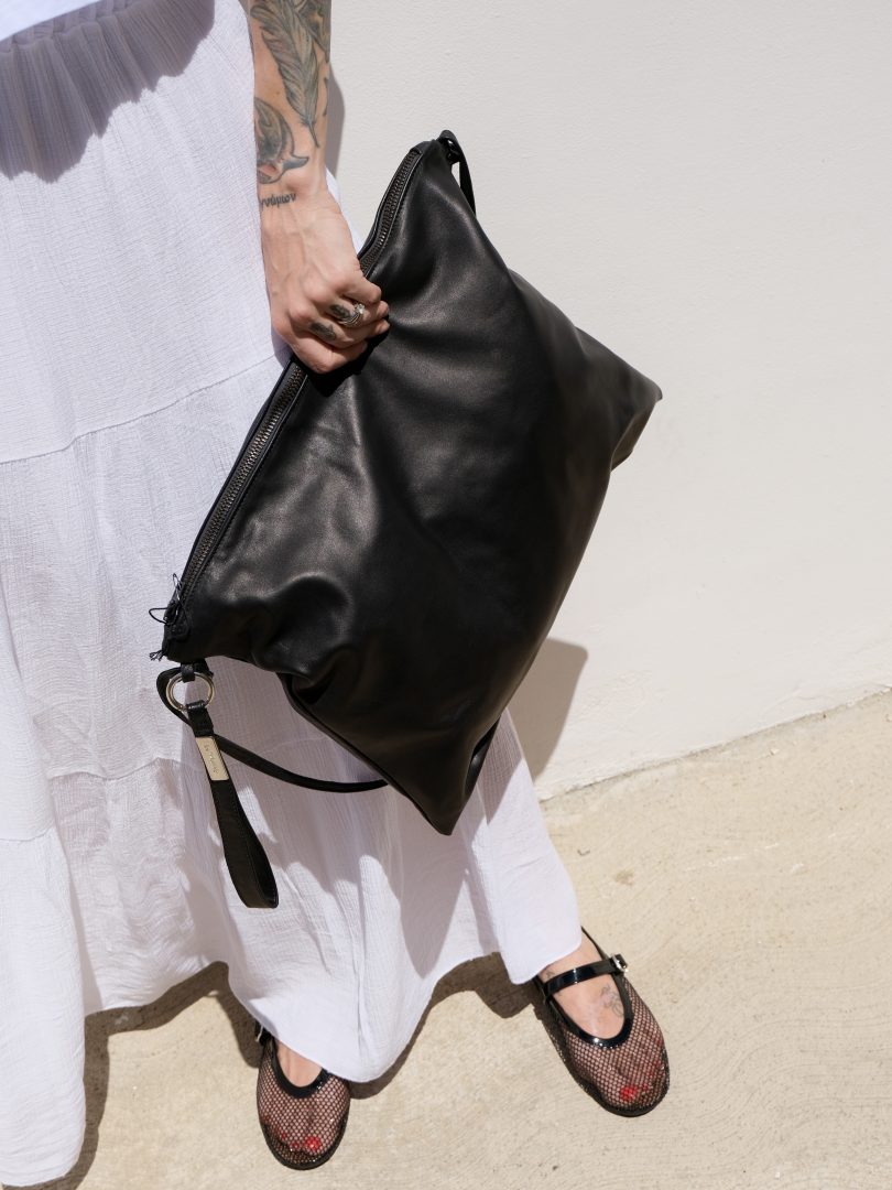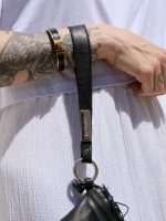 Pochette in vera pelle liscia nera con polsiera e tracolla.