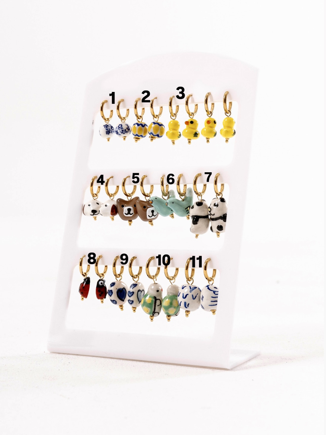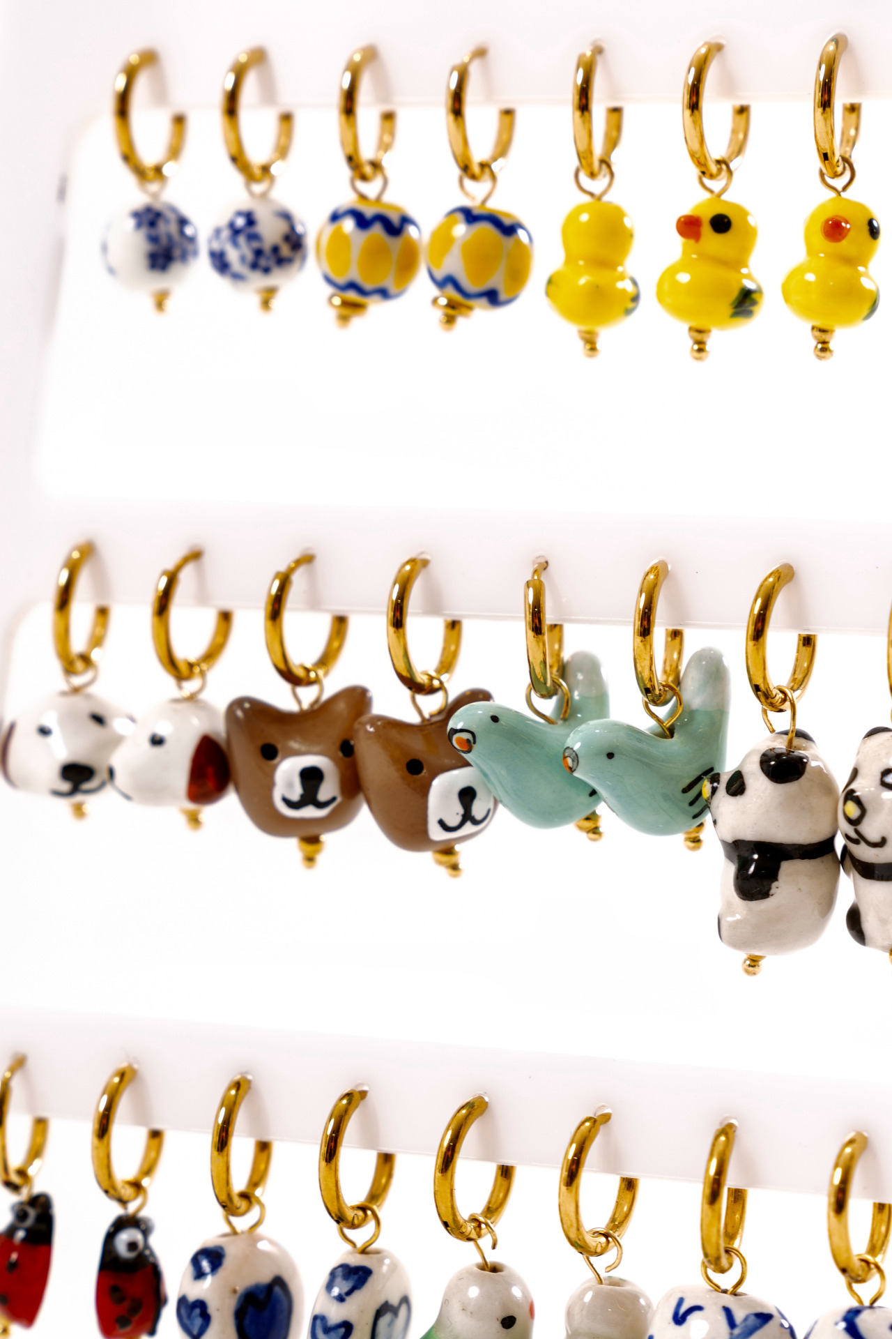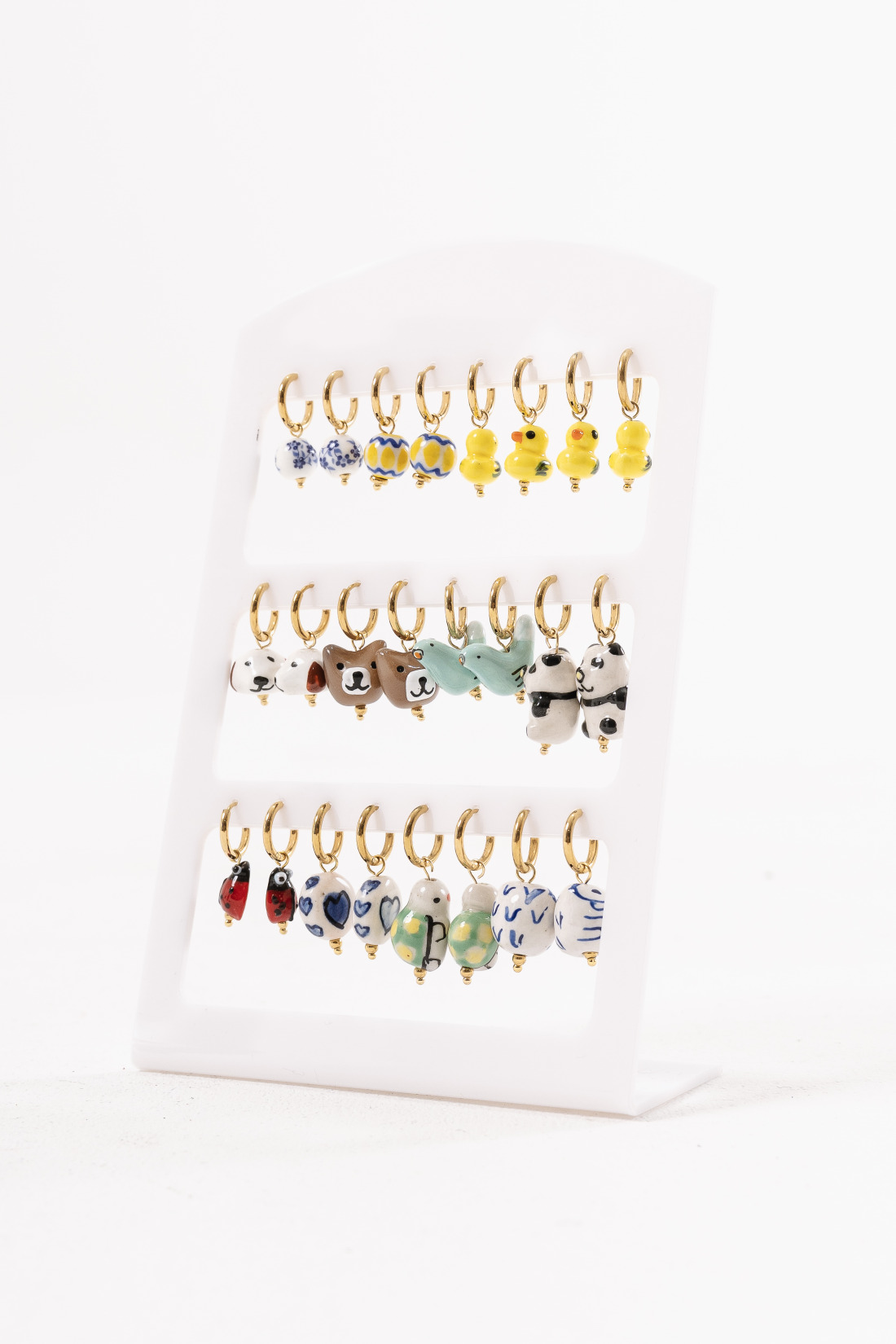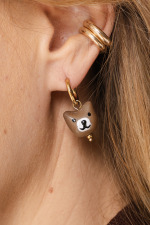 Coppia di orecchini a cerchio in acciaio dorato con charm in ceramica.