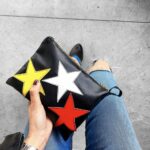 Borsa pochette in ecopelle nero con stelle colorate applicate.