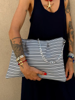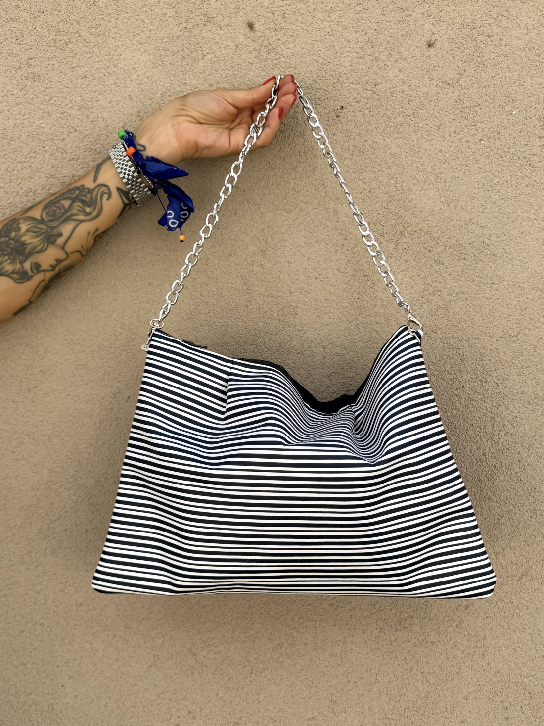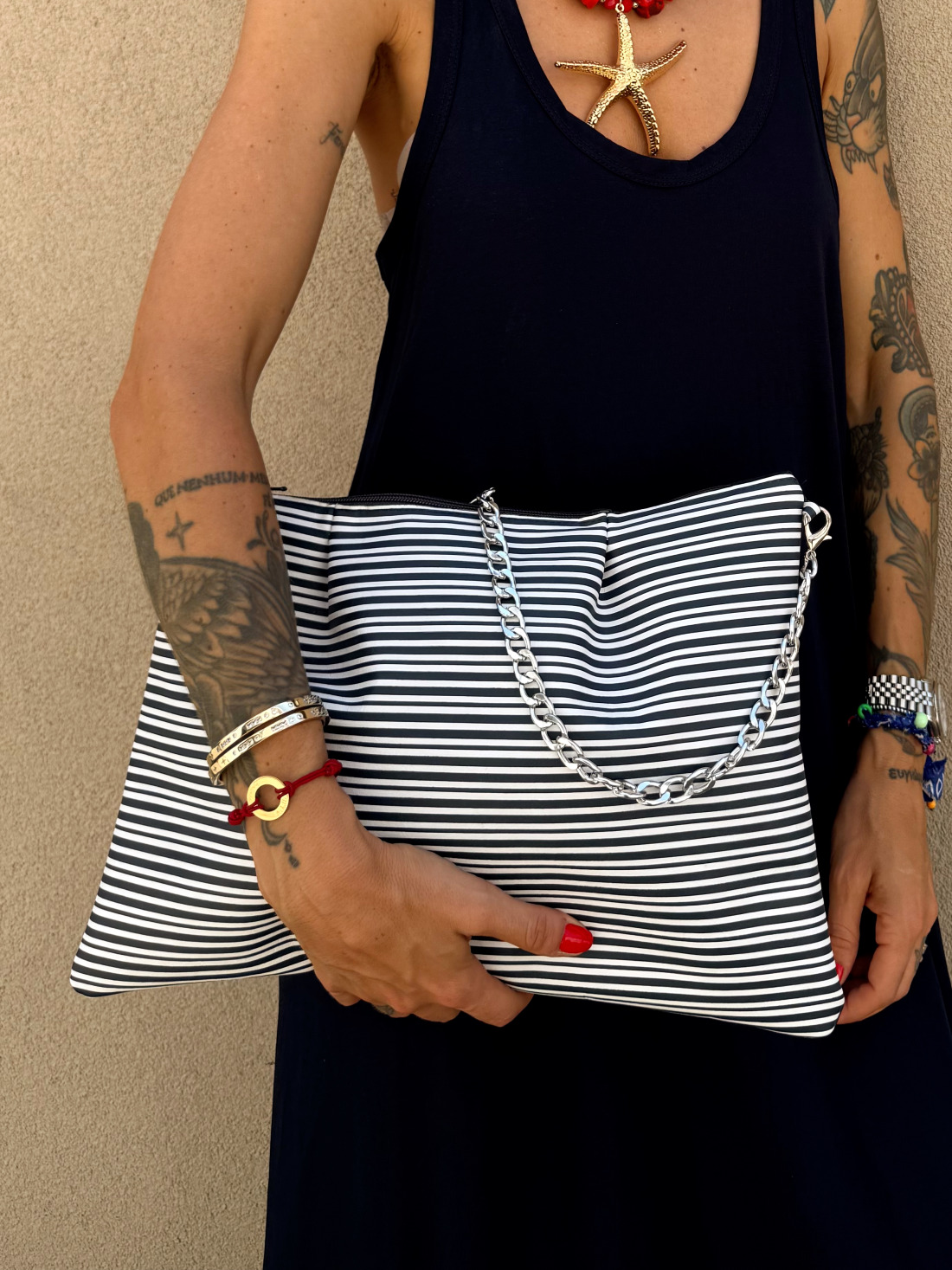Borsa in vera pelle stampata a righe e pelle sintetica blu navy con tracolla in catena argentata, chiusura con zip.