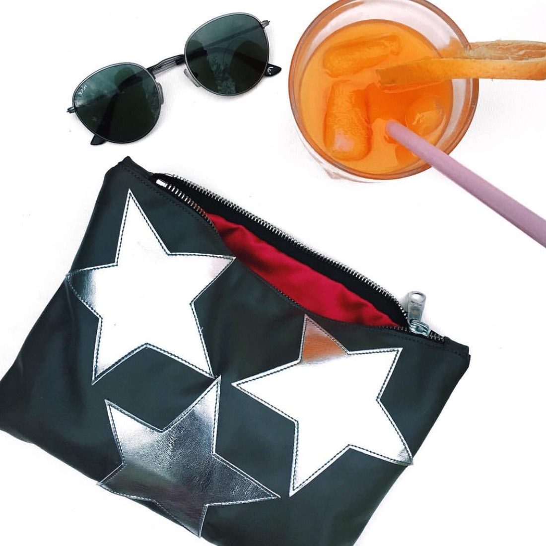 Borsa pochette a mano con zip, stelle argento applicate su fondo grigio.