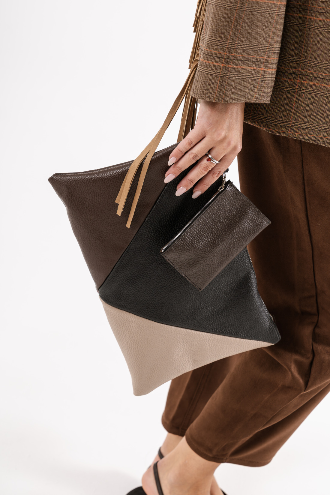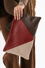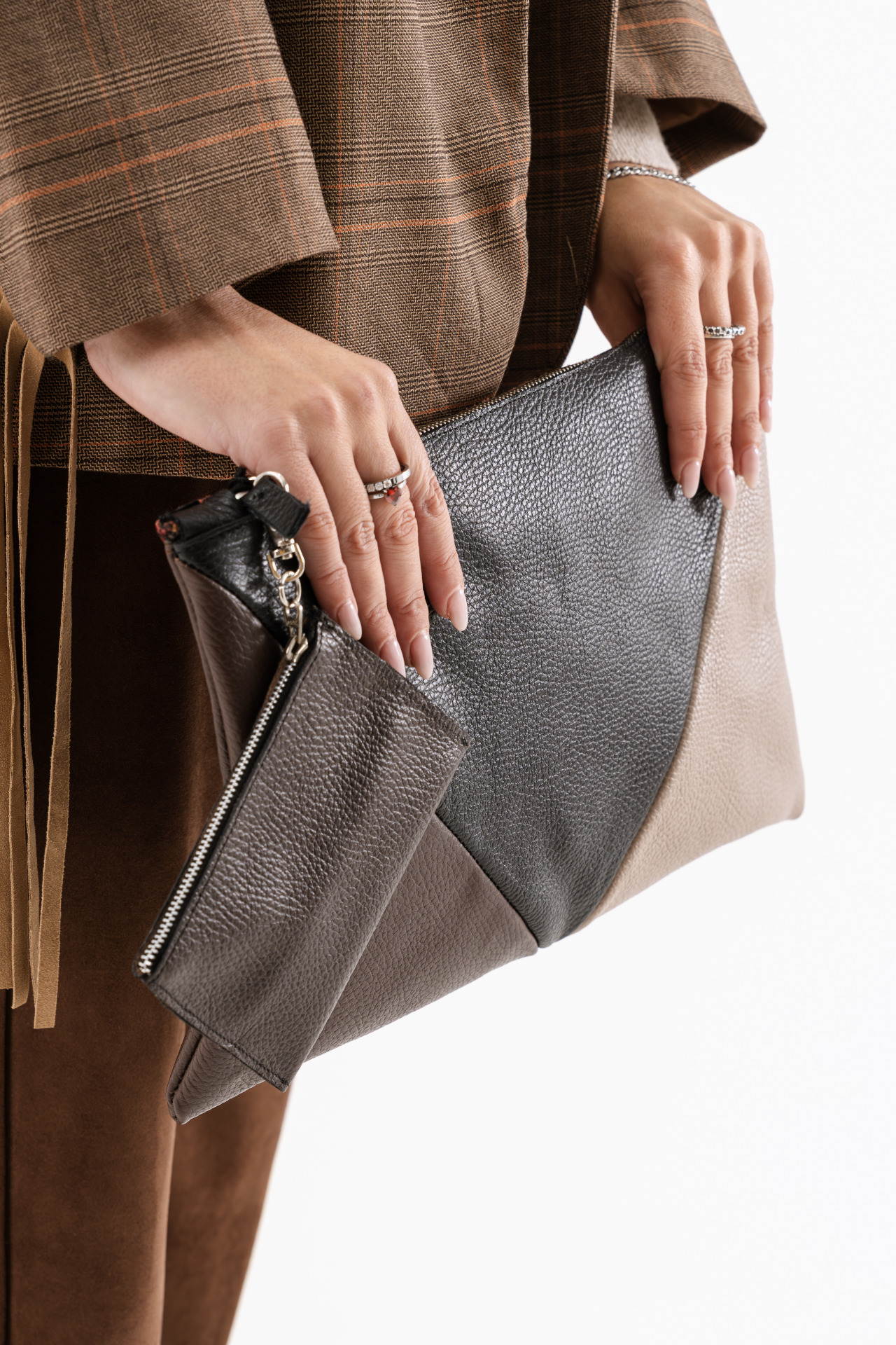 Questa pochette tricolore in vera pelle, con un design sofisticato che gioca sapientemente con i contrasti.