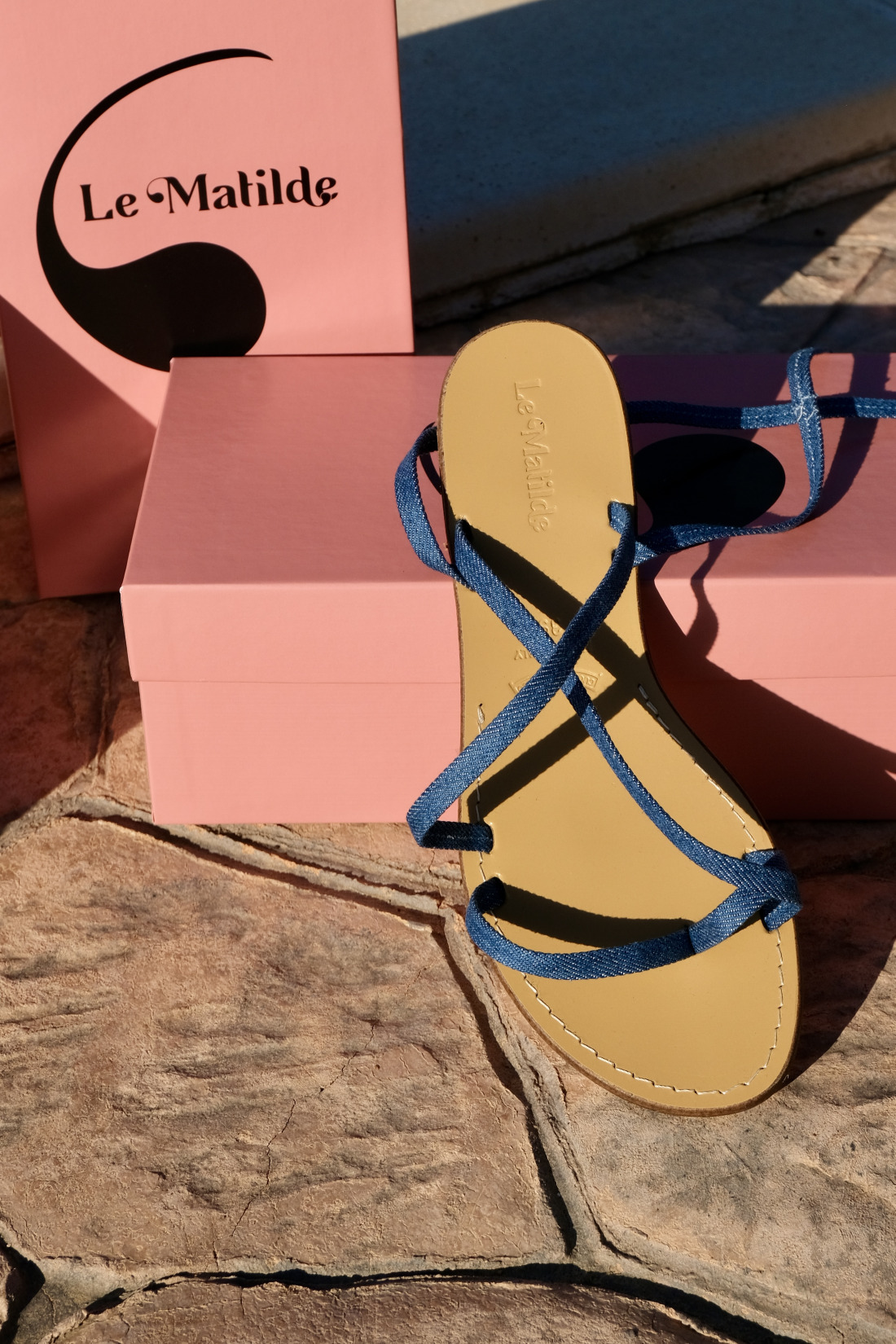 Esalta la tua estate con il nostro sandalo artigianale in cuoio, 100% Made in Italy. Realizzato con materiali di alta qualità, questo modello presenta sottili cinturini in tessuto denim che si intrecciano elegantemente sul piede, garantendo un look raffinato e femminile. La suola in cuoio naturale offre comfort e resistenza, perfetta per accompagnarti con stile durante le giornate più calde.