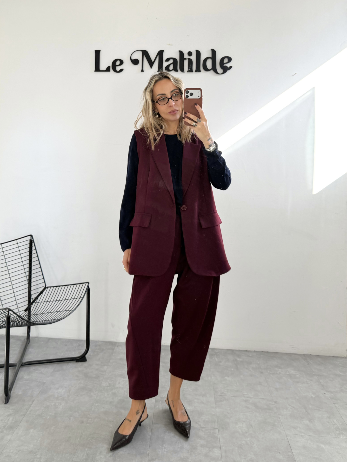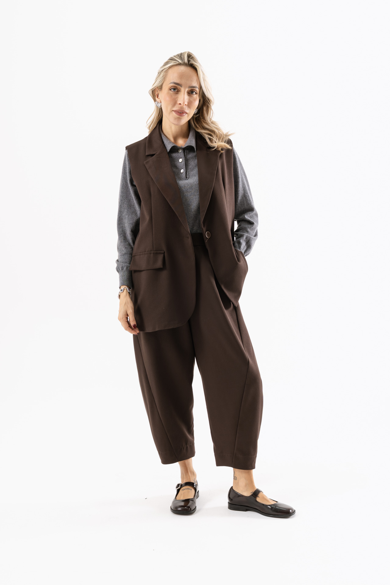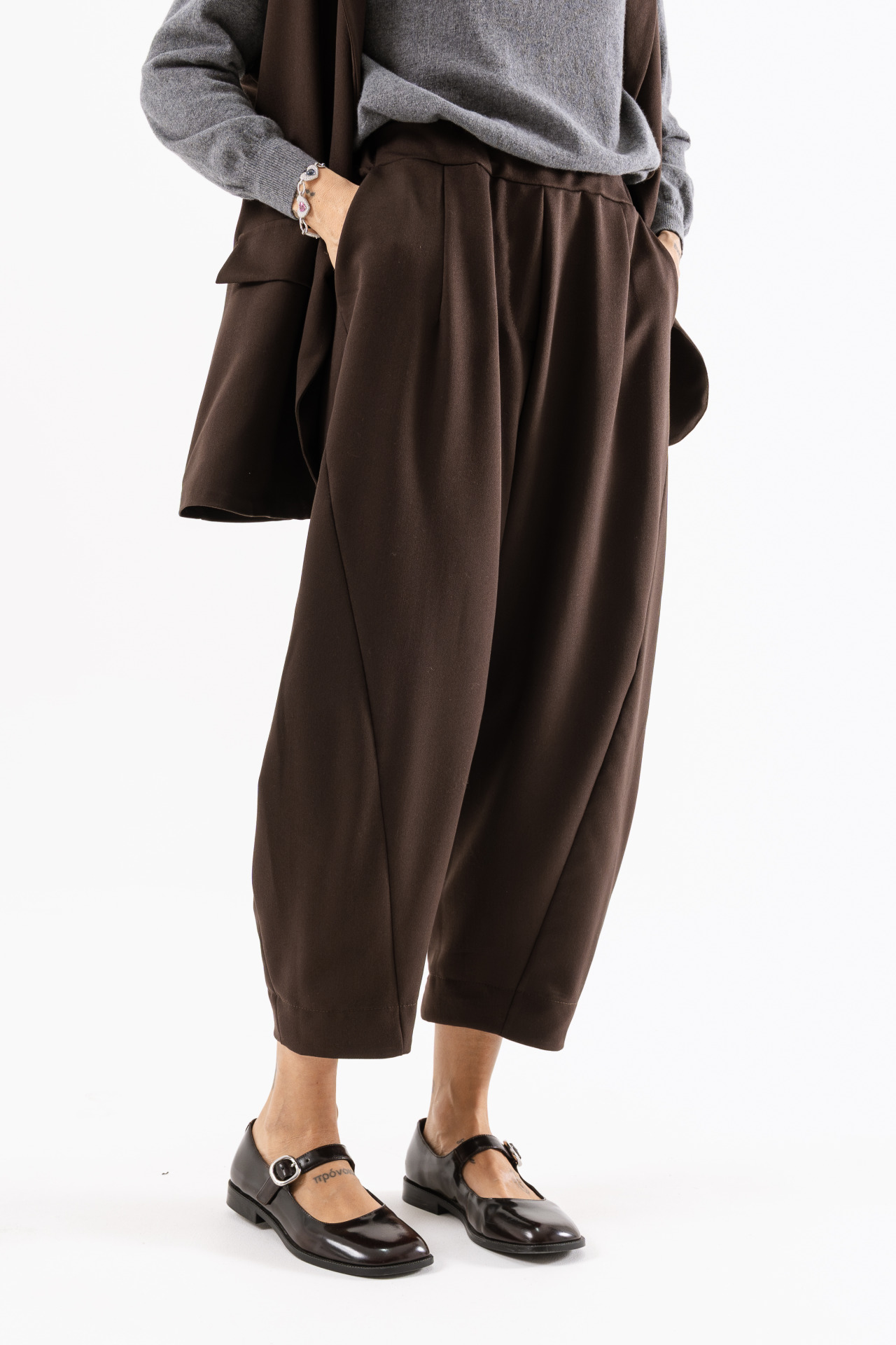 - pantalone ad uovo con elastico in vita e tasche laterali