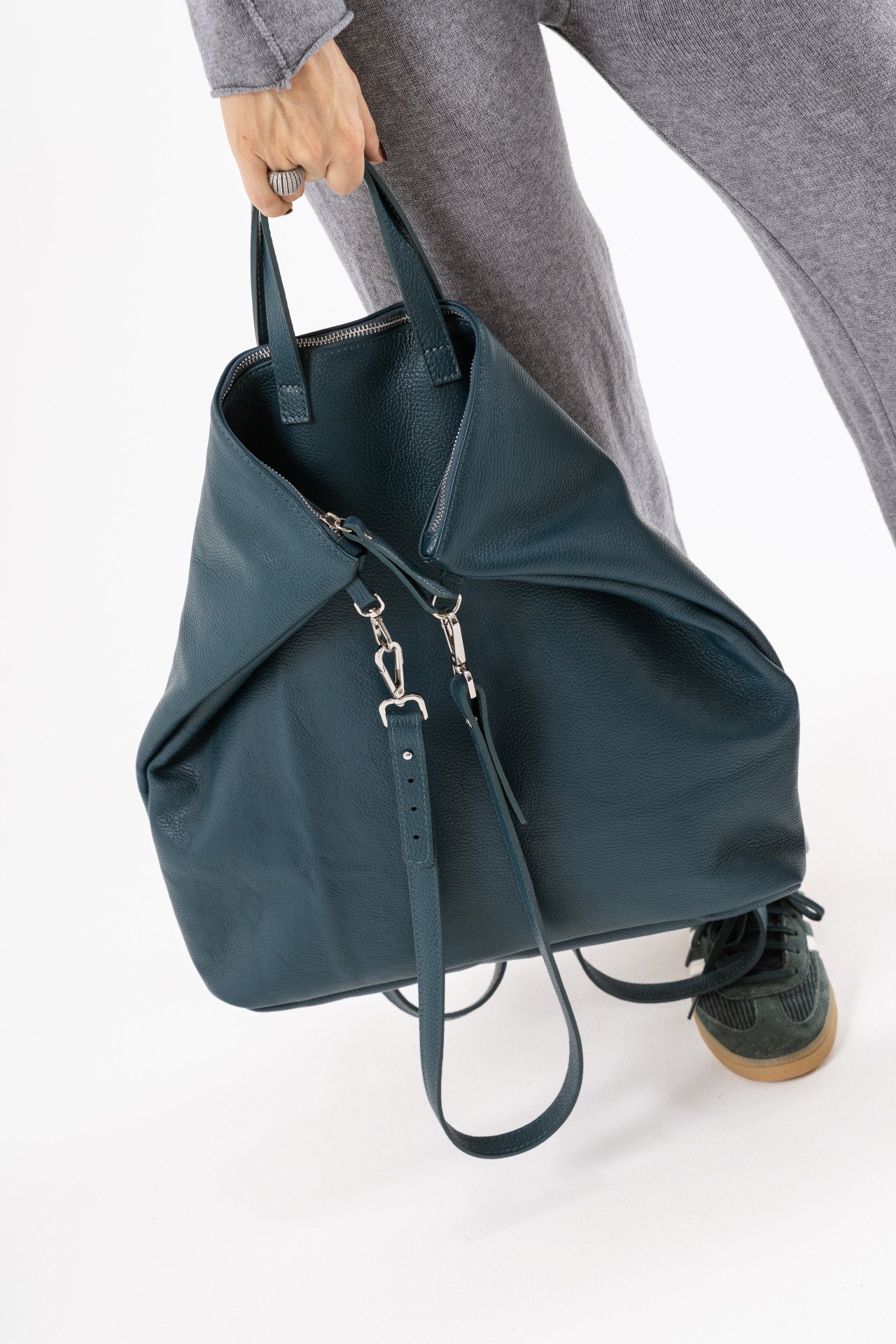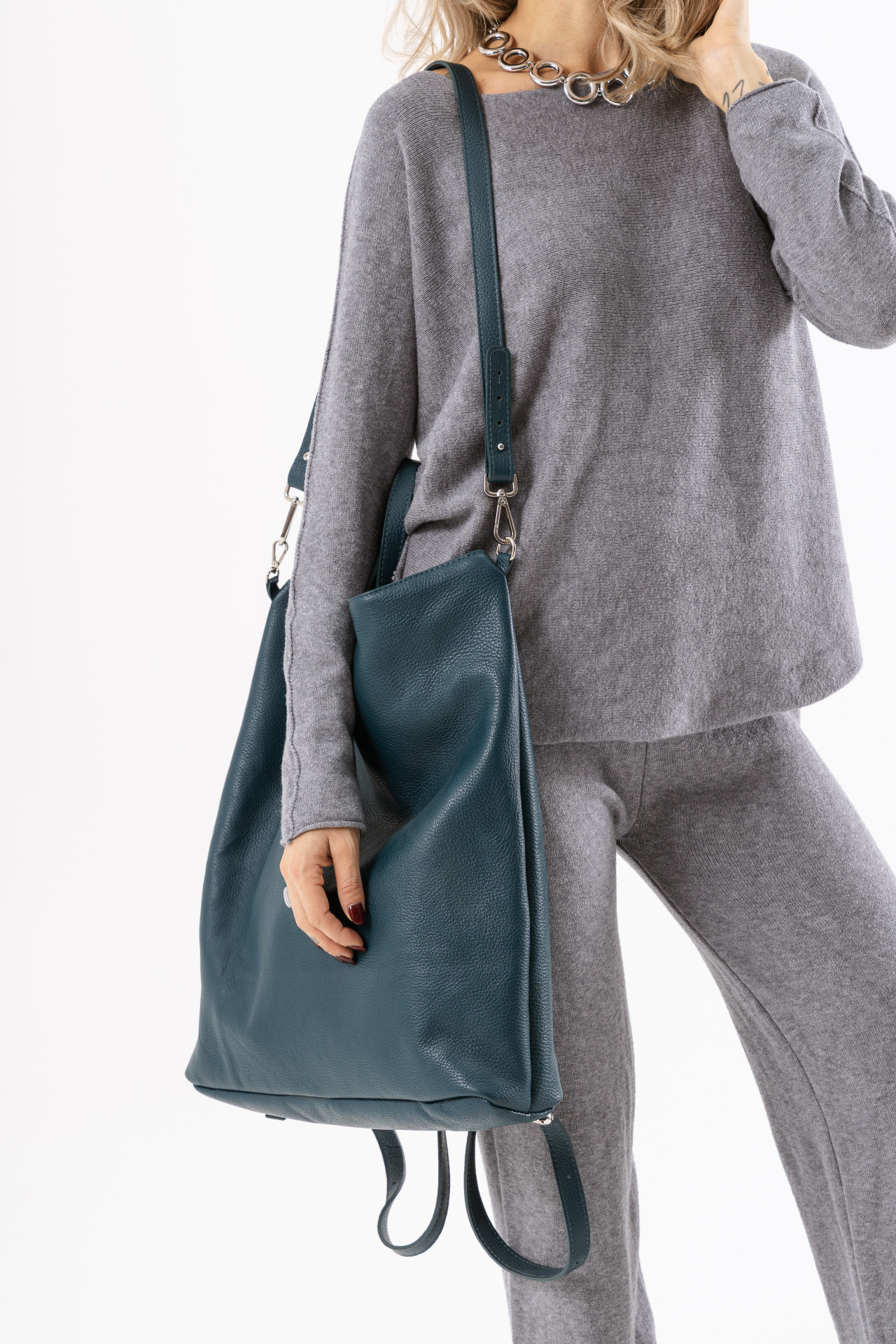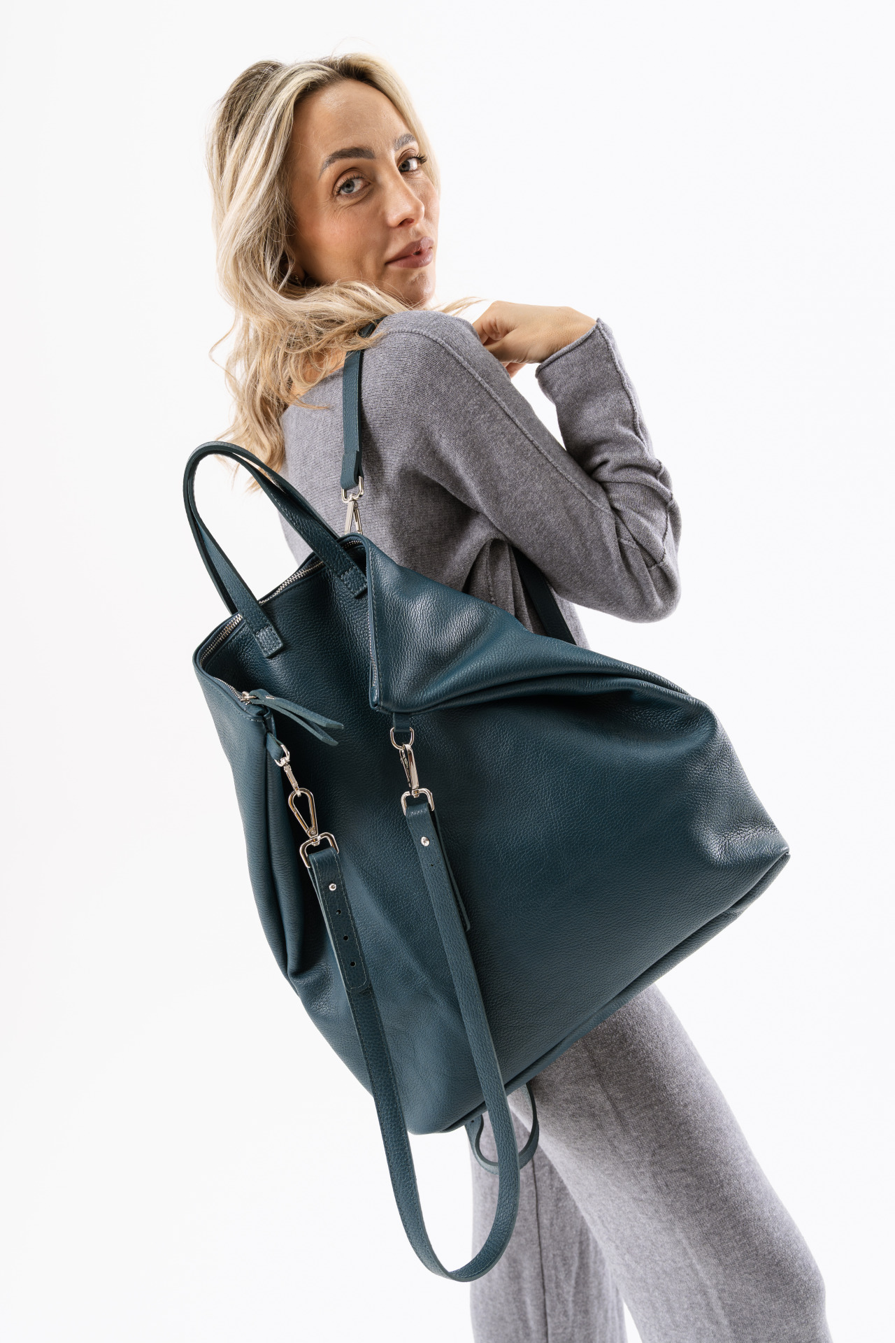 Borsa in vera pelle bottalata, si indossa a mano, a tracolla e a zaino.