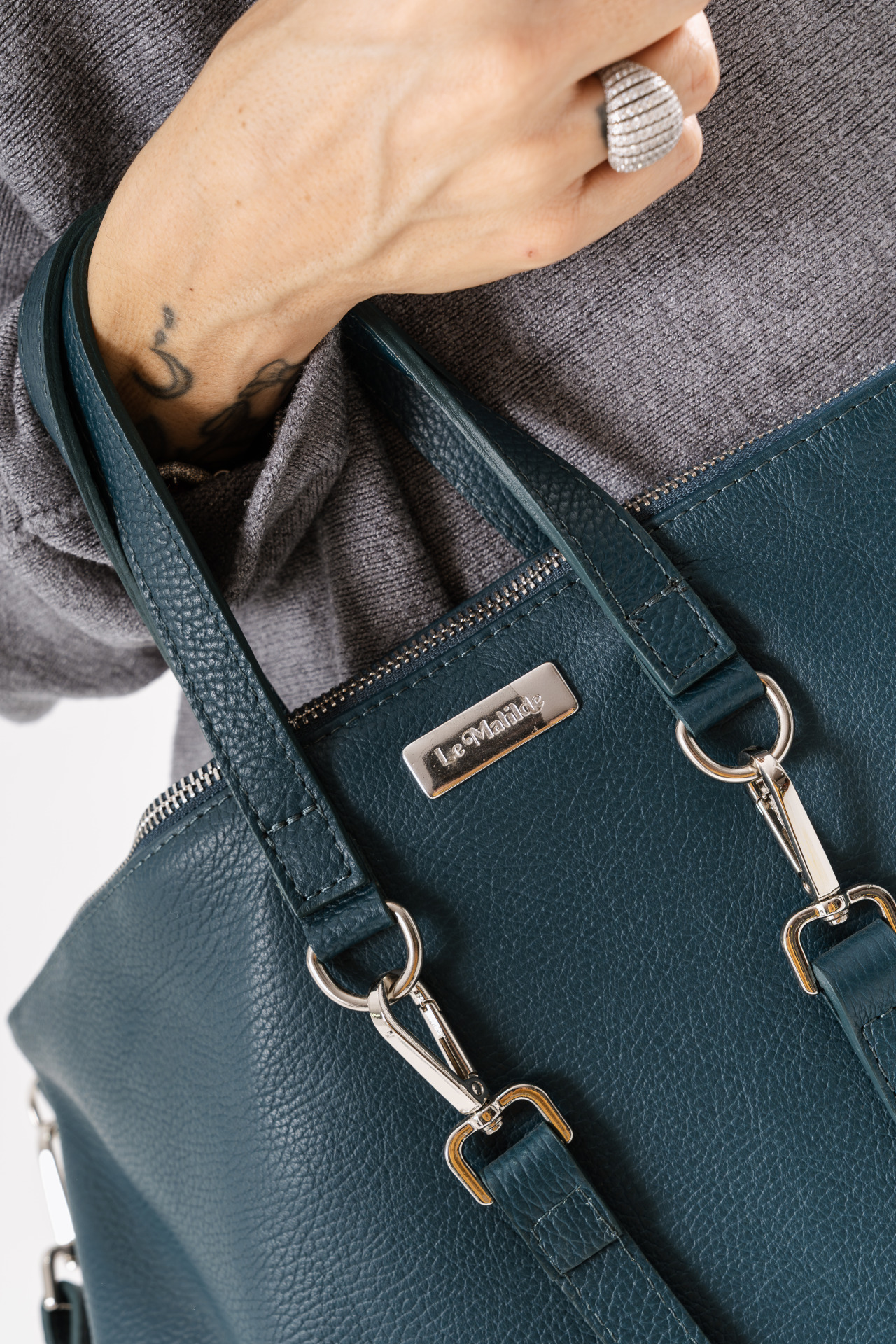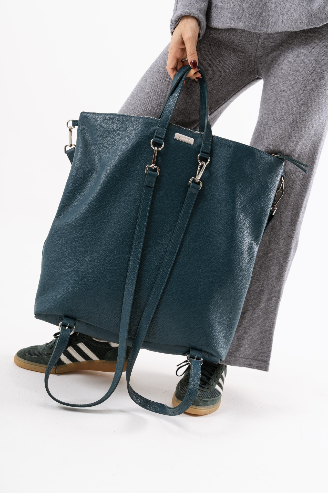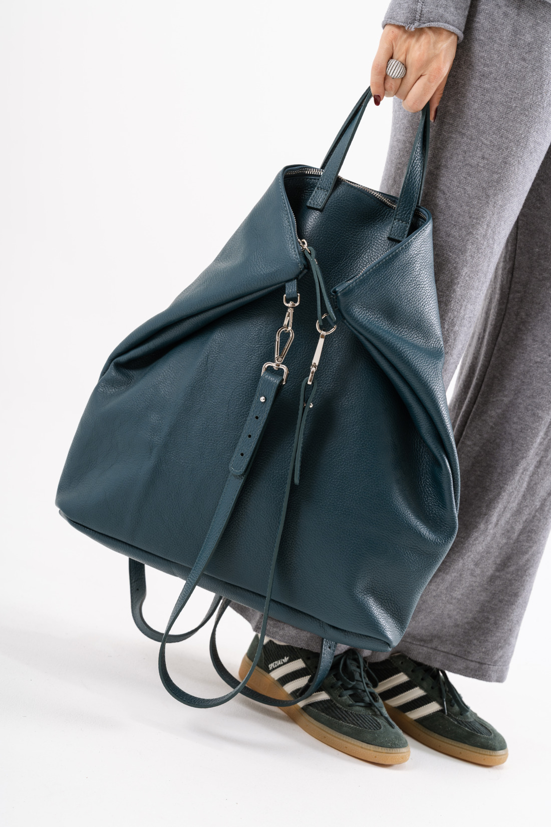 Borsa in vera pelle bottalata, si indossa a mano, a tracolla e a zaino.