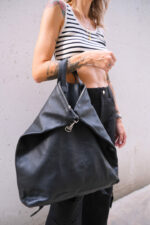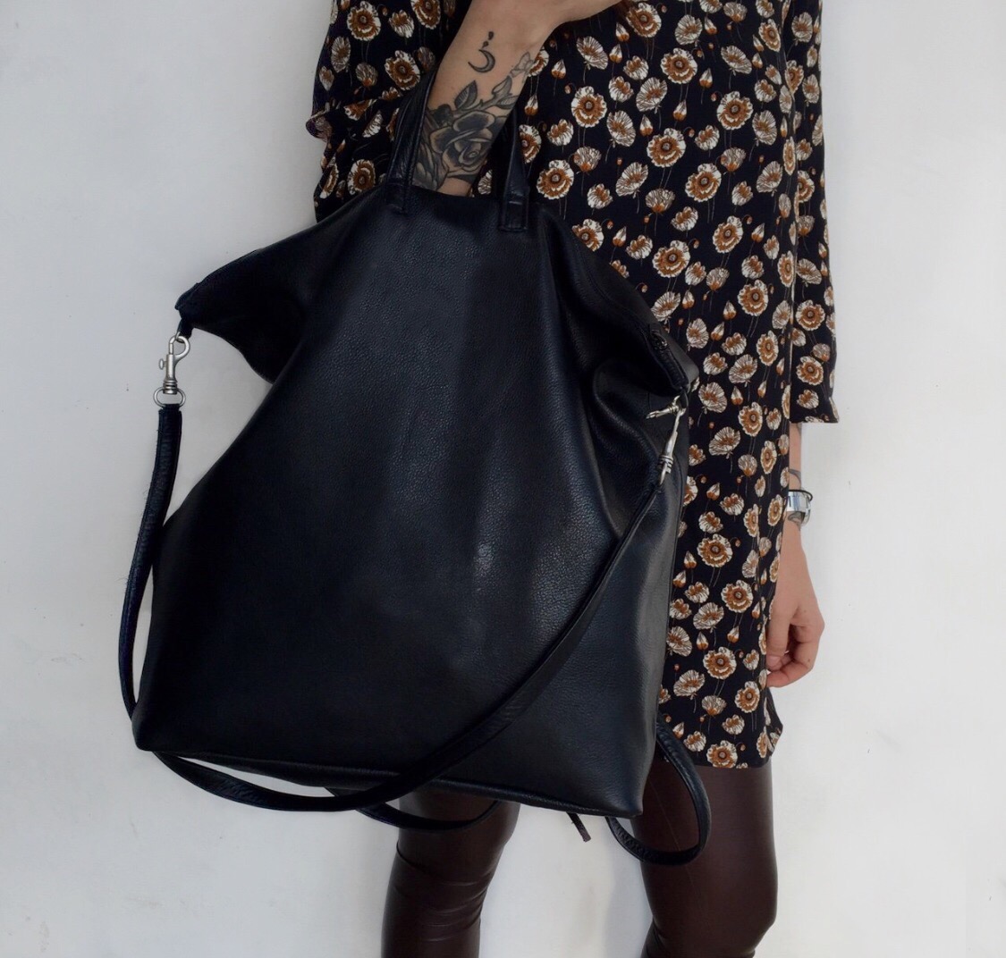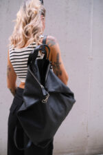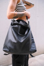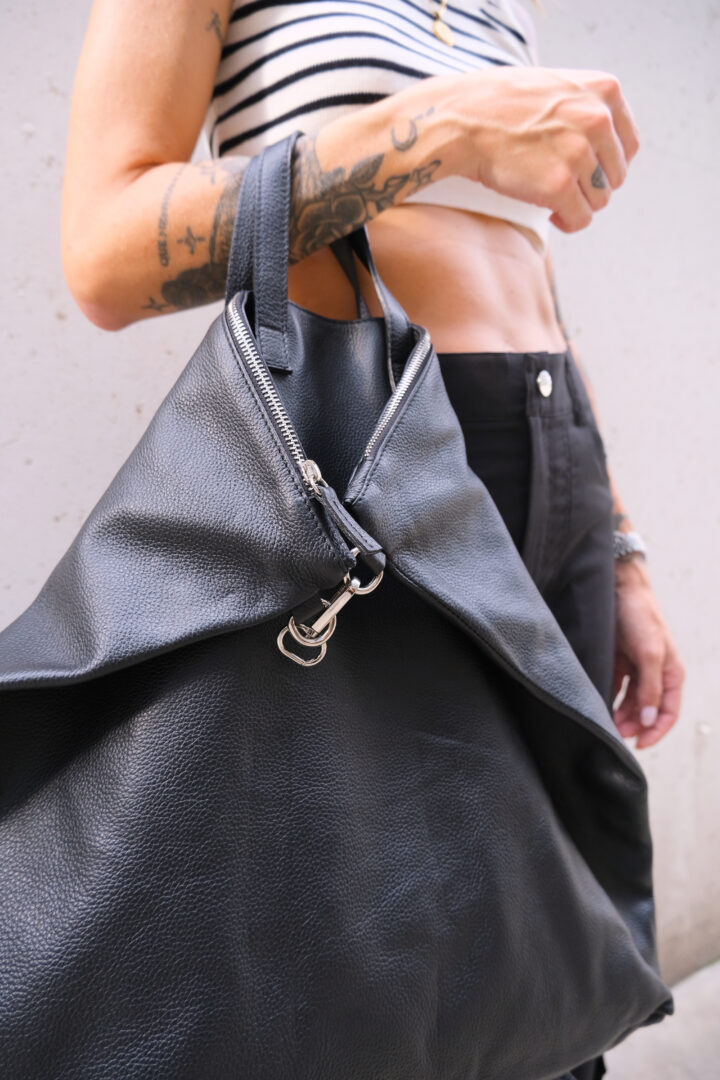 Borsa in vera pelle bottalata nera, si indossa a mano, a zaino e a tracolla.